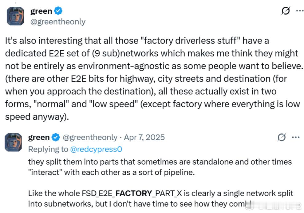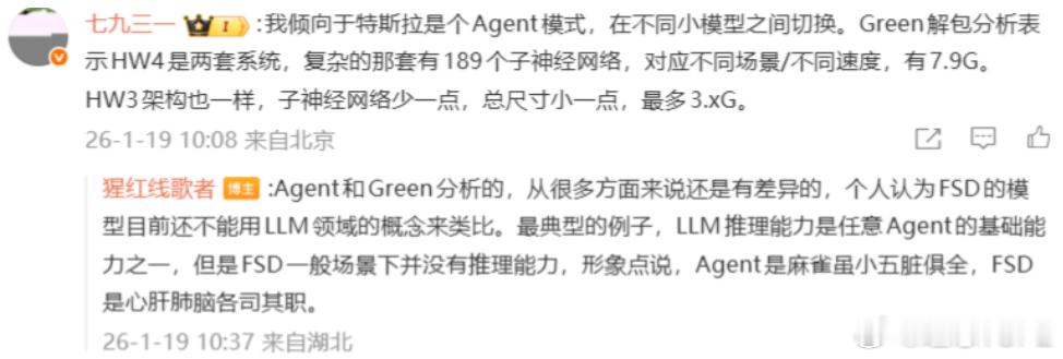能看懂|讲清楚为什么刘延说特斯拉FSD是近200个小场景模型的组合2026年1月19日知乎用户刘延发布《智驾行业学习笔记|特斯拉FSD模型的非共识》最关键的一点是基于X用户green在2025年4月发的推文,如果认可green说的为真,则V13就一定有189个神经网络模型。节点 A 包含 189 个神经网络,而节点 B 包含 110 个神经网络,61 个神经网络为节点 A 与节点 B 所共享。HW3 与 HW4 平台之间共享的神经网络数量总计达到 135 个。HW3 平台在当前的 v12.6 版本中,其节点 A 大小为 1.2G,节点 B 大小为 3.1G;HW4在v13版本中,节点 A 大小为 2.3G,节点B 的大小增至 7.5G。图1为什么如果green说的为真,就一定有189个小模型?因为green是对固件的反向分析,实实在在数出来有189个独立的神经网络文件。green是是一位持续通过逆向工程的手段,深入挖掘特斯拉的车辆固件和硬件系统,有极高技术造诣的白帽黑客。与特斯拉的关系是一种微妙的对抗与合作共存的状态,green曾通过特斯拉漏洞赏金计划报告安全漏洞,受到了官方认可。另一方面green对保密信息的持续挖掘也会破坏特斯拉的节奏,正是green的存在才让V13有189个小模型变成一件几乎无可辩驳的事。green:同样有趣的是,所有那些‘工厂内无人驾驶功能’都拥有一套专用的端到端(E2E)网络组(包含 9 个子网络),这让我觉得,它们可能并不像某些人希望相信的那样完全‘不挑环境’(即具备通用的环境适应性)。 (此外,还有针对高速公路、城市街道和目的地——即当你接近目的地时——的其他 E2E 模块,所有这些实际上都存在两种形态:‘常速’和‘低速’——工厂模式除外,因为那里本来就全都是低速场景。green:他们把这些网络拆分成了若干部分,这些部分有时是独立运行的,有时又像某种流水线一样相互交互。举个例子,整个 FSD_E2E_FACTORY_PART_X(工厂端到端某部分)显然就是一个单一网络被拆解成了多个子网络,不过我现在还没时间去研究它们具体是如何重新组合在一起运作的。图2 刘延和猩红线歌者讨论中认为FSD没有agent那么智能,背后的锚点是认为LLM Agent更像是是推理,先思考,在决定调用哪个工具,每个agent都能独立处理复杂问题,FSD更像是人体的器官,肺只负责呼吸(工厂模型只用于工厂),心脏只负责跳动(城市模型只用于城市)。图3刘延提到HW3能跑36赫兹就肯定是小模型,背后的逻辑链是这样的36赫兹意味着处理一帧画面的时间必须小于1/36≈27.7ms一个100亿参数的模型在INT8精度下大约9.3GB,在INT4精度下大约4.7GB。自动驾驶行业一般是INT8精度,INT4被认为是激进精度。由于HW3只有68 GB/s的显存带宽,即使是INT4精度下,只能有 4.7/68≈69ms根本跑不到36赫兹。68 GB/s的显存带宽要想跑到36赫兹,理论模型最大上限是27.7ms*68GB/s≈1.88GB,这根本放不下单一的能处理所有情况的大模型。而green说HW3的模型大小为节点A大小为1.2GB,节点B大小为3.1GB,正好也能匹配。基于以上这些点,刘延认为特斯拉强在工程而非科学,特斯拉的丝滑,并非完全来自于它的算力和模型,有很大一部分是来自于特斯拉重写了车控操作系统,让从控制到执行的延时低了很多。理想汽车理想汽车理想i6理想i8理想MEGA理想VLA理想L6理想L7理想L8理想L9