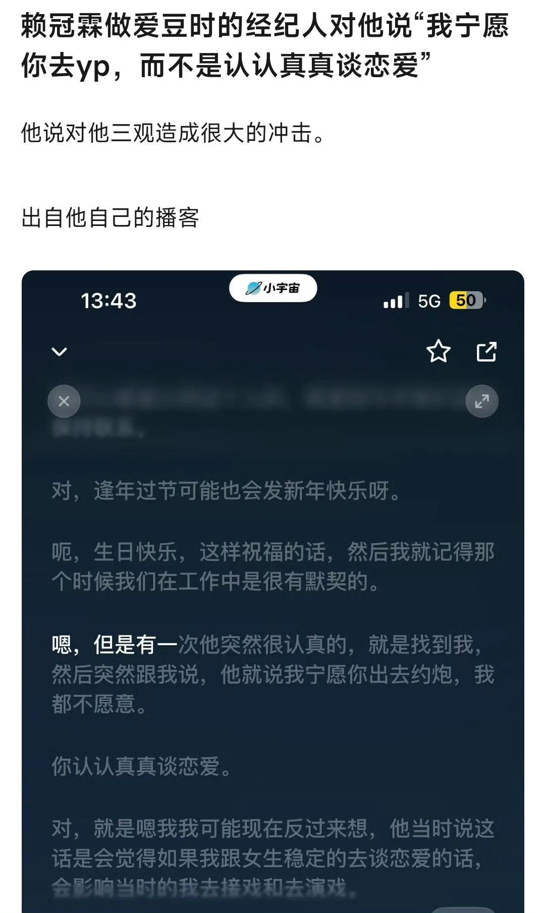 赖冠霖自曝经纪人奇葩言论 宁愿约炮不愿恋爱 内娱偶像恋爱有多难 简直颠覆三观!赖冠霖在播客里说的这番话,听完让人直呼离谱——偶像时期关系超铁的经纪人,居然直言“宁愿你出去约炮,也不愿你认认真真谈恋爱”。 要知道这位经纪人可不是普通同事,是赖冠霖当时打心里认同的人,工作上默契十足,就算到现在两人还保持着联系,谁能想到会说出这种颠覆价值观的话。 经纪人的理由很现实:稳定恋爱会影响接戏和事业,一旦公开恋情,平台和片方的舆论压力都会砸向团队,相比之下约炮的商业风险更可控。 这番话给当时的赖冠霖造成了巨大冲击,毕竟对普通人来说,认真恋爱是珍贵的情感,怎么到了偶像行业,就成了比随性关系更该规避的风险。 其实这背后是内娱偶像产业的残酷逻辑:偶像贩卖的是粉丝的幻想,稳定恋情会打碎这种幻想,导致粉丝流失、代言受损,一系列连锁反应让团队避之不及。 就像之前檀健次的恋情传闻,女方24小时内就官宣分手,就是为了把风险降到最低,现在的年轻偶像连恋爱都得搞“风险管控”。 赖冠霖从韩国选秀出道,经历过偶像产业最严格的规则,后来转型演员、导演,还拿过金鸡相关奖项,如今敢说出这段经历,也是看透了行业的畸形。 网友看完都炸了,有人说“这是什么离谱的价值观,把情感当商品管控也太病态了”,也有人感慨“偶像也是人,连正常恋爱都要被干涉,太没人性了”。 行业里这种畸形认知不是个例,日本偶像的“恋爱禁止条例”写进合同,国内更是把这套逻辑发挥到极致,偶像成了不能有真实情感的“商品”。 但反过来想,真正的粉丝爱的应该是艺人的作品和人品,而不是虚幻的单身人设,那些能坦然面对情感、有担当的艺人,反而更让人有好感。 赖冠霖愿意把这种行业潜规则说出来,其实是在打破畸形现状,让大家看到偶像背后的无奈,也引发了对行业规则的反思。 爱情从来不是事业的绊脚石,畸形的行业规则才是。 艺人首先是人,有追求爱的权利,粉丝也该学会接受偶像的真实,而不是强求对方活在幻想里。 内娱早该告别这种“灭人欲”的规则了,当艺人不用再为正常恋爱提心吊胆,行业才能更健康地发展,作品才会成为真正的核心竞争力。 希望赖冠霖的爆料能敲响警钟,让行业多些人性化,少些畸形的风险管控,让偶像和粉丝都能回归理性,让作品说话,而不是被虚假人设绑架。上热门涨粉100万粉丝 @DOU+小助手