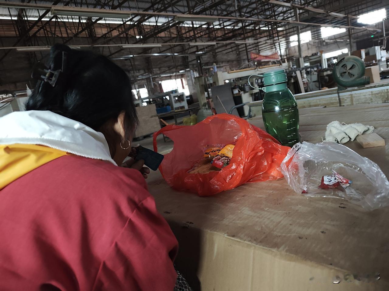 冬日生活打卡季元月21日傍晚,吃不惯饭堂的米饭,女工坐在车间里吃食品。可怜的打工人!