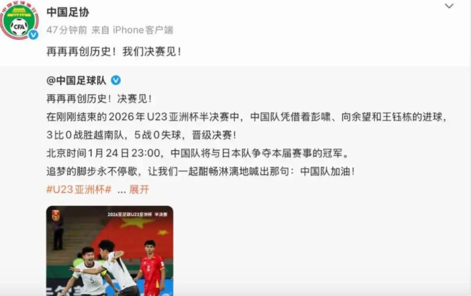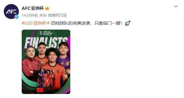足协发文祝贺中国∪23男足创历史!喊出“追梦的脚步永不停歇,中国队加油”的口号! AFC官网同时也发文称赞∪23国足 “完美逆袭,只差临门一脚”! 主帅安东尼奥则表示: 中国足球太需要这种励志的感觉了,14日对阵日本,我们将全力去战斗!