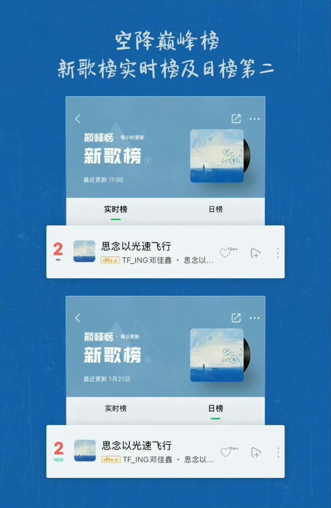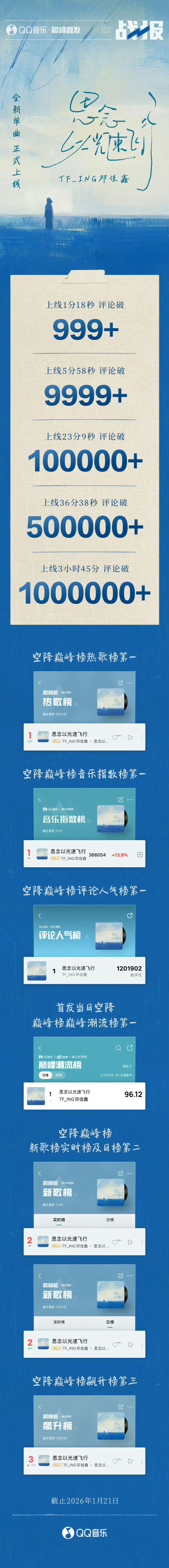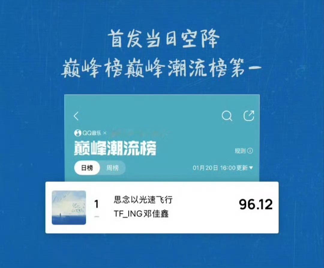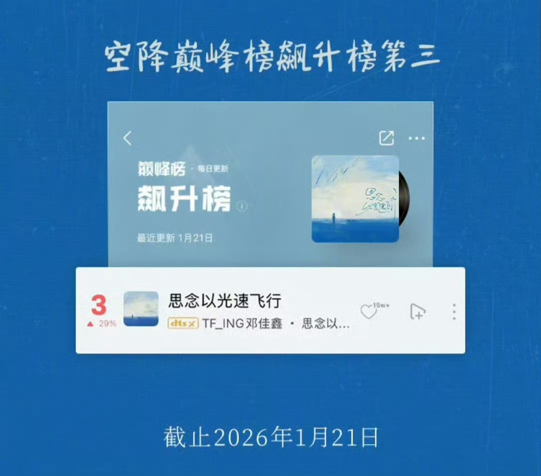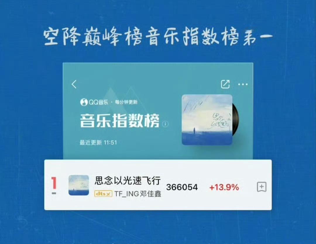 邓佳鑫《思念以光速飞行》新歌热度认证💥▶ 1分18秒 评论区火速破999+▶ 3小时45分 全网热度突破1000000+▶ 空降巅峰榜热歌榜、音乐指数榜、评论人气榜、巅峰潮流榜 四榜第一实力唱将,热度全开!