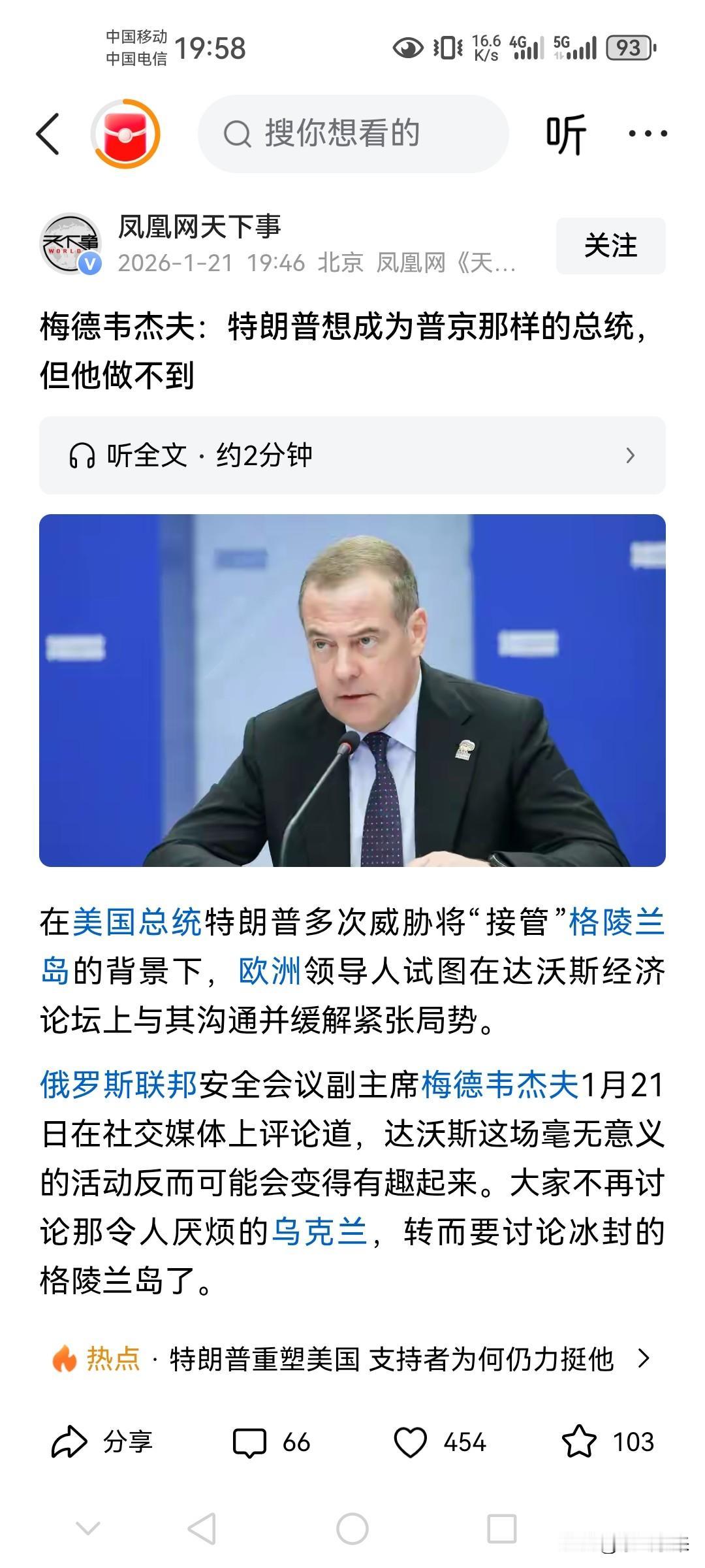 梅德韦杰夫:特朗普想成为普京那样的总统,但是他做不到! 作为俄罗斯联邦安全会议副主席梅德韦杰夫,说的这句话我非常赞同! 虽然特朗普和普京都70多,但毕竟年龄相差6岁多! 特朗普79岁,普京73岁! 普京前几天还参加俄罗斯的传统节日,浸入冰窟进行洗礼,庆祝主显节,由此可见普京的身体非常硬朗,展现自己的硬汉形象! 普京执政俄罗斯已经20多年,可谓是俄罗斯的功勋总统,深得俄罗斯人民爱戴! 反观特朗普作为美国总统,也是特朗普的最后一任总统,美国宪法规定总统最多两届,每届四年!再过三年特朗普下台,普京依然还是总统!梅德韦杰夫 普京