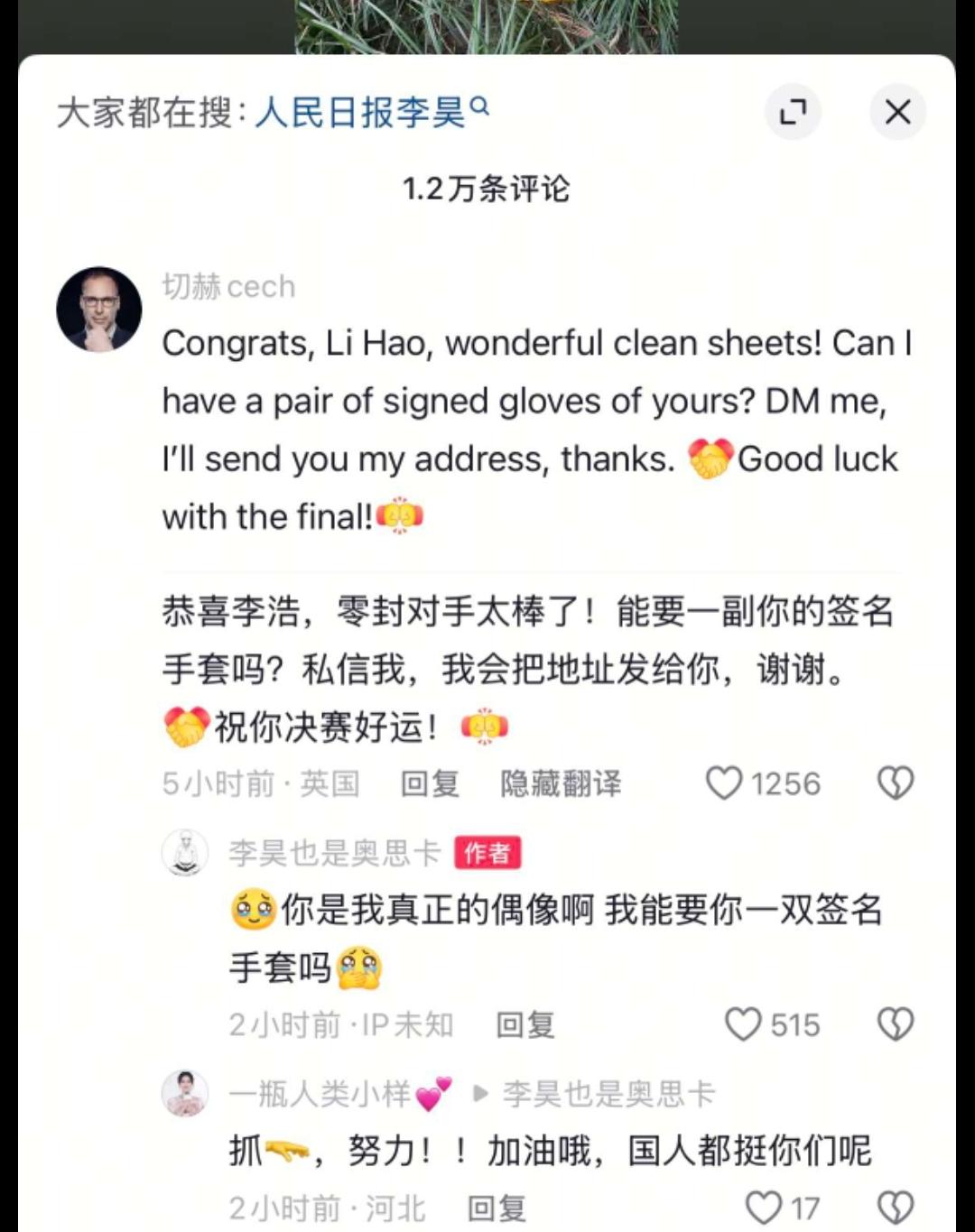 我的天,梦幻联动!门神切赫点赞李昊,并留言想要签名。果然实力才是硬道理呀,连这种级别的门将都能主动点赞! 毫不客气的说,李昊绝对是2026年开年以来中国最火的足球运动员,不过贡献5场0封的他绝对值得。李昊同时回复切赫是他的真正偶像,并想要签名手套。 众多球迷看到两人的友好互动后,也纷纷点赞,并且友好的调侃道,门神遇见门神。球迷们也鼓励李昊,下一场比赛继续零封,拿下那最后的冠军奖杯。