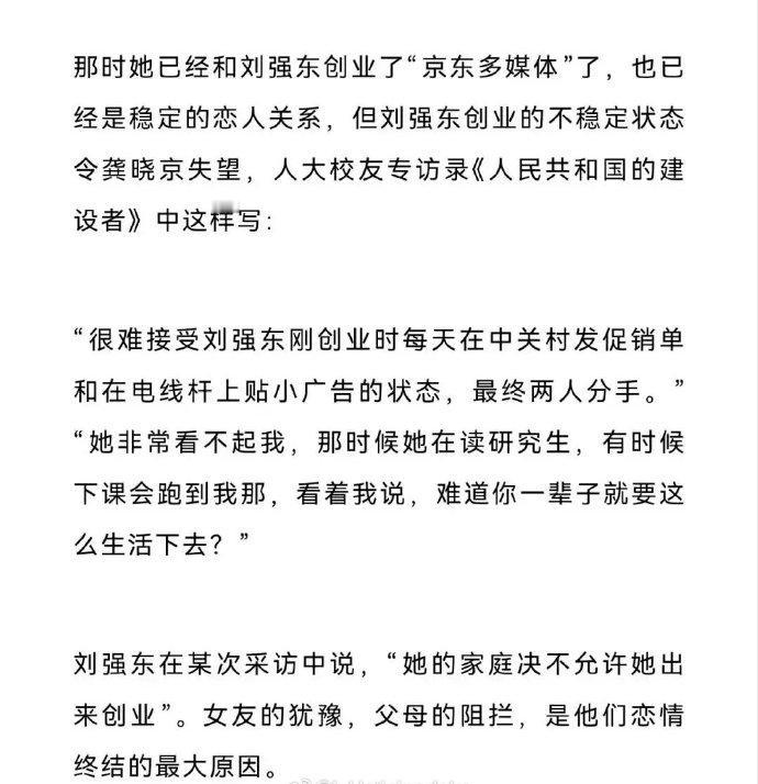 刘强东对曾经的初恋其实一直念念不忘。京东上市时“东”还特意请了“京”来着,那时候还没章泽天的事,大概这段恋情太出名了,以至于好些人把“东”婚前生的孩子算到“京”的头上了。 不过话又说回来,得不到的才是最好的。如果当初在一起了,可能会变成的凤凰男的故事。 现在说起来浪漫其实还是因为最后没走到一起,如果真结婚了那可就不一定了。