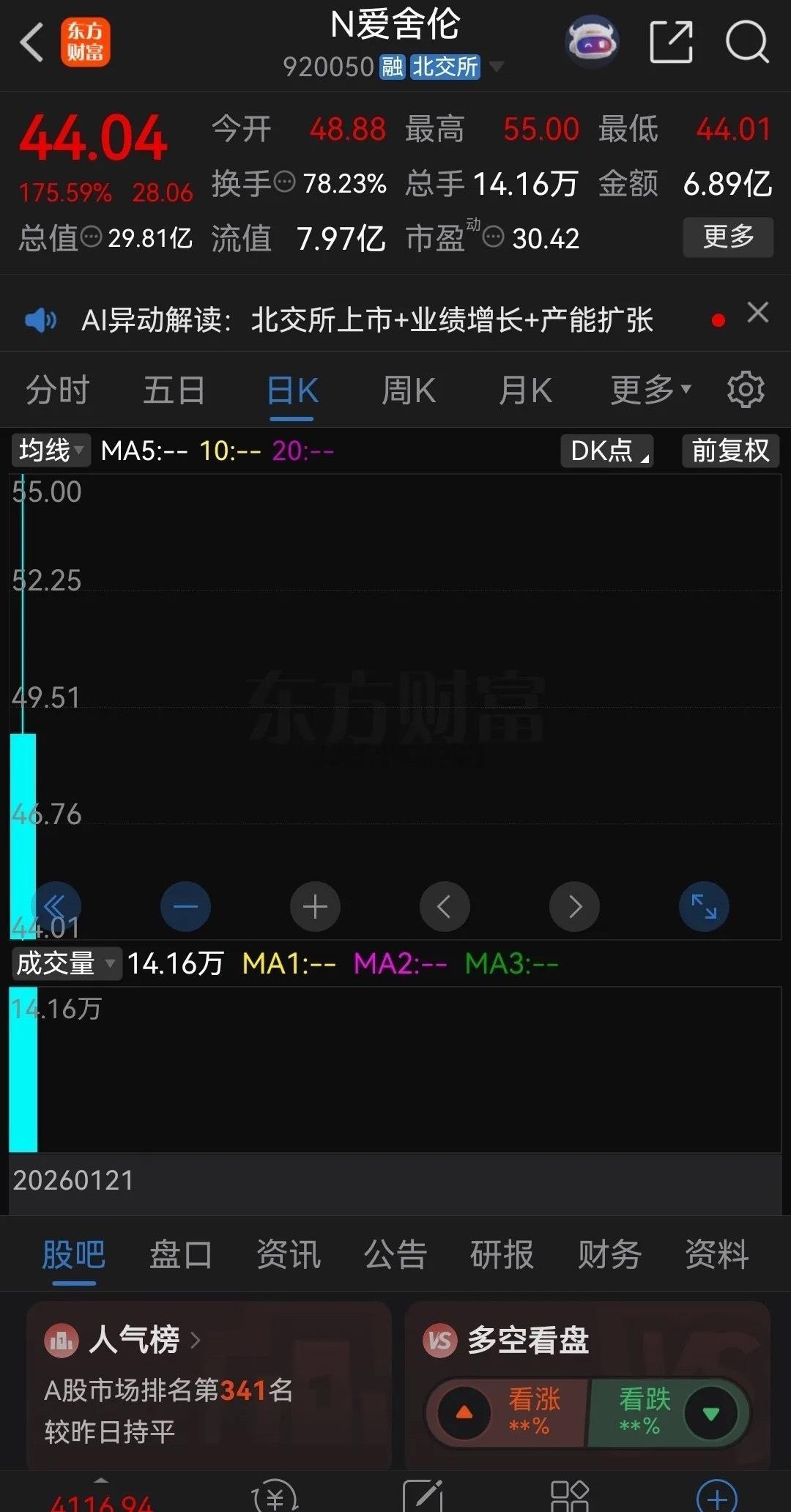 今天上市的新股又把不少股民们挂在了山顶!北交所今天上市的爱舍伦,又给喜欢炒作新股