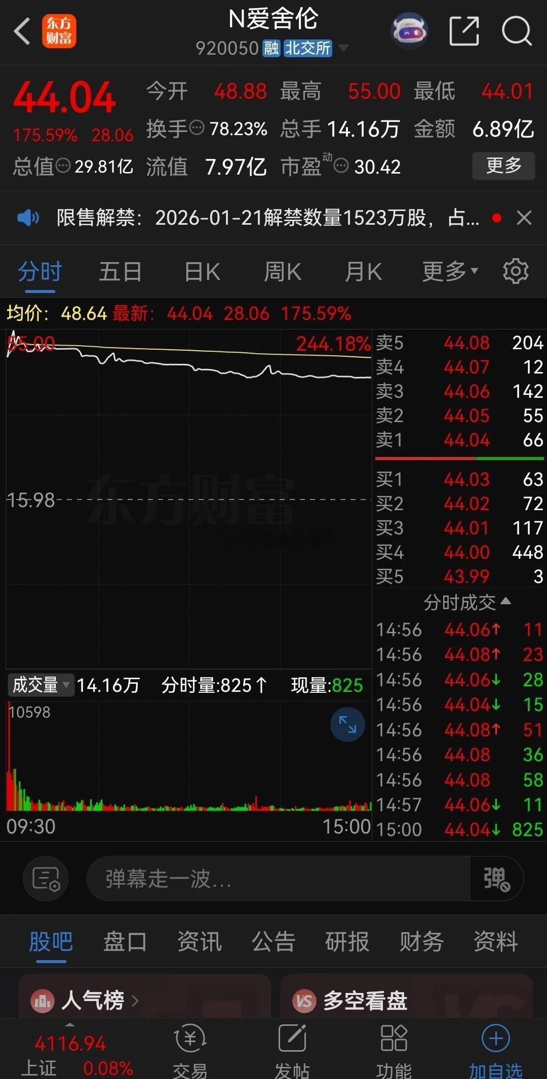 今天上市的新股又把不少股民们挂在了山顶!北交所今天上市的爱舍伦,又给喜欢炒作新股的股民深深地上了一课。公司发行价15.98元,所属行业为医药生物-医疗器械,主营业务为一次性医用耗材的研发、生产和销售。今天爱舍伦在北交所成功上市,开盘于48.88元,开盘后股价快速拉起,盘中最高涨到了55元,涨幅一度高达244.18%。然而一波急拉过后股价又快速回落,随后一路震荡下行,收盘几乎以最低点收盘(仅比全天最低价高3分钱),涨幅还有175.59%,较高点回落了68个点的涨幅。k线收出一根倒垂大阴线,今天进场的股民全部被套牢,最高的已经浮亏20%。早上一开盘就冲进去的股民,成了大冤种,直接被挂在了山顶,真是起了个大早,赶了个晚集!