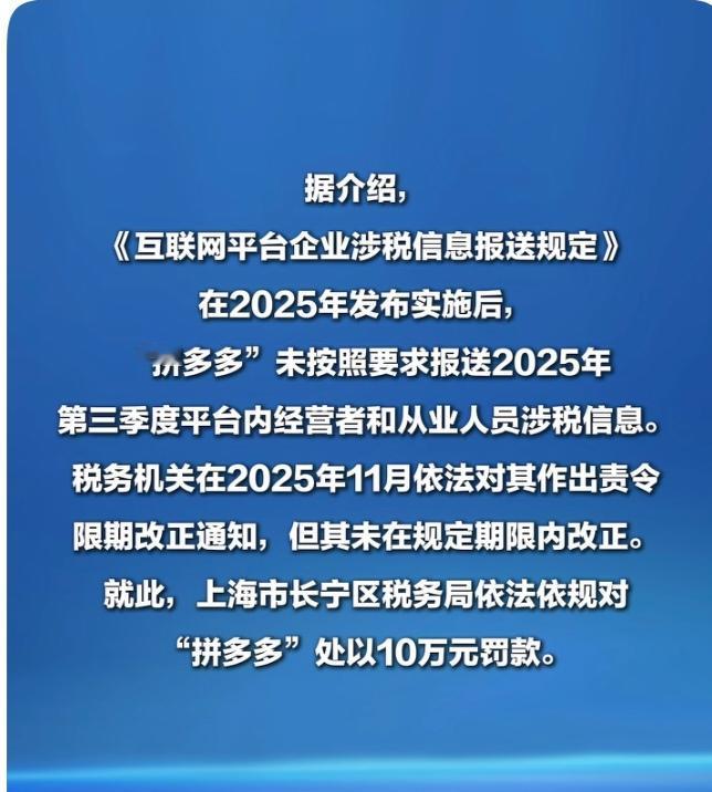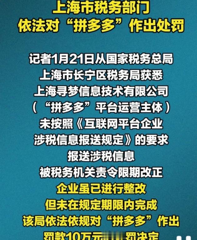 上海市税务部门依法对“拼多多”未按规定送涉税信息进行处罚。 拼多多运营主体上海寻梦信息技术有限公司,未按规定报送2025年第三季度涉税信息,逾期未完成整改,被上海市长宁区税务局罚款10万元。 1. 2025年:《互联网平台企业涉税信息报送规定》正式发布实施。 2. 2025年第三季度:拼多多运营主体未按规定报送该季度平台内经营者和从业人员涉税信息。 3. 2025年11月:税务机关对拼多多作出责令限期改正的通知。 4. 2026年1月21日:上海市长宁区税务局因拼多多逾期未完成整改,依法对其作出罚款10万元的处罚决定。 2. 核心法律依据 1. 《互联网平台企业涉税信息报送规定》第二条、第四条:明确互联网平台企业需报送平台内经营者和从业人员的身份、收入等涉税信息,且要在季度终了的次月内完成上季度信息报送。 2. 《互联网平台企业涉税信息报送规定》第十条:未按规定期限报送涉税信息,税务机关先责令限期改正;逾期不改正的,处2万 - 10万元罚款,此为本次10万元罚款的直接依据。 3. 《中华人民共和国电子商务法》:与上述《规定》法律责任条款一致,同样明确未按规定报送涉税信息逾期不改正的,处2万 - 10万元罚款,情节严重的还会面临停业整顿及更高金额罚款。