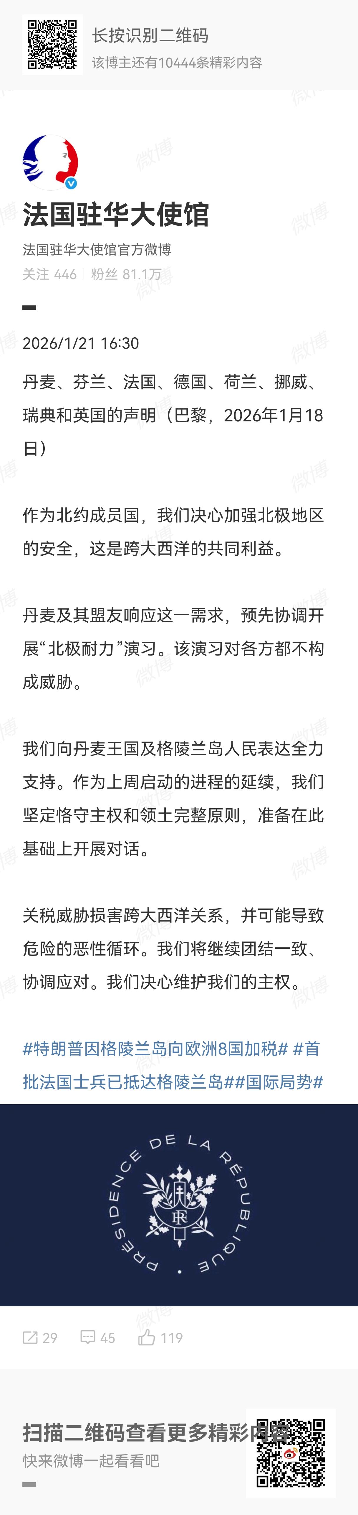 这是丹麦、芬兰、法国、德国、荷兰、挪威、瑞典和英国1月18日发表的联合声明,看完了心生感慨:人家已经贴脸开大,你们连人家的名字都说不出口,这国家名字很烫嘴。 如果戴高乐和丘吉尔知道他们的后代是这样子,可能要把棺材板掀翻了,就算是张伯伦知道也会掀棺材板。我喜欢那个桀骜不驯、不可一世的欧洲,现在的欧洲会让人有一种“胜之不武”的寂寞。
