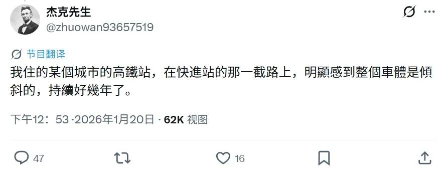 这位湾湾说的是大陆的高铁,至于高铁车体是倾斜的,他连这个也不懂,还真不好解释,只是想问难道你们湾湾的是平的?就说是斜的不正常,那为何几年了却一点问题没有呢,你还是修修你的脑子吧,也许是你的脊柱侧弯了吧。