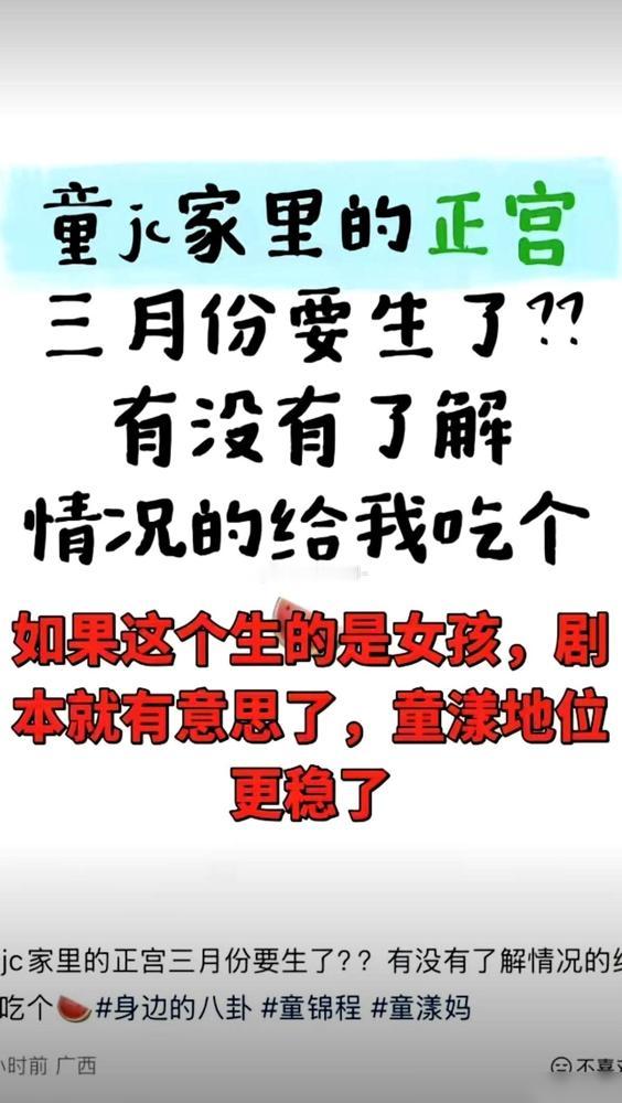 童锦程那边刚传出消息,新女友怀了,正牌太子,预产期就在三月。 这事儿是那位“真嫂子”亲自在粉丝群里放的锤,消息硬得不行,直接把原本就扑朔迷离的局面给彻底定调了。 我最在意的是这个时间差,算算日子,童漾那边才刚出生两个月左右,这边预产期就排到了明年三月。 这意味着在那段日子里,两条生命的时间线是完全重叠的,这哪是谈恋爱,这简直是在搞高强度的“多线并行”。 回想起当初童漾妈妈挺着肚子要钱拿掉孩子、童家却一分不给的旧事,现在看确实让人背后发凉。 我感觉那时候的冷漠可能并不是因为他们“死板”,而是因为他们早就选好了最优解,正在冷眼旁观。 在这场局里,感情好像变成了可以精准计算的成本,甚至孩子都被分出了三六九等。 对那个家庭来说,这大概率不是一个关于责任的选择题,而是一场已经写好结局的通知。 这种拿现实人生当宫斗剧本玩的操作,说真的,比直播间里的任何剧情都要冷酷得多。