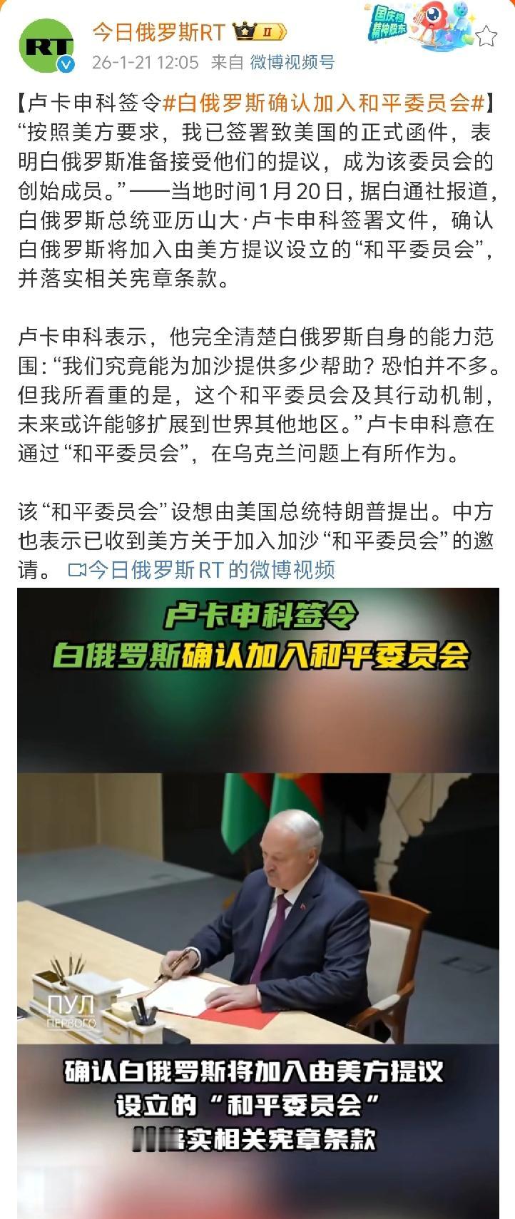 一个最让人想不到的国家确定加入特朗普创建的“和平委员会”,它就是白俄罗斯! 以色列加入,可以想得到,因为美以一向亲如兄弟;匈牙利加入,也可以想得到,因为欧尔班与特朗普私交甚笃;但白俄罗斯加入,则真的出人意料。 今日俄罗斯RT认为,卢卡申科意在通过“和平委员会”,在乌克兰问题上有所作为。 那么,未来或还有更多想不到的国家,选择加入“和平委员会”。