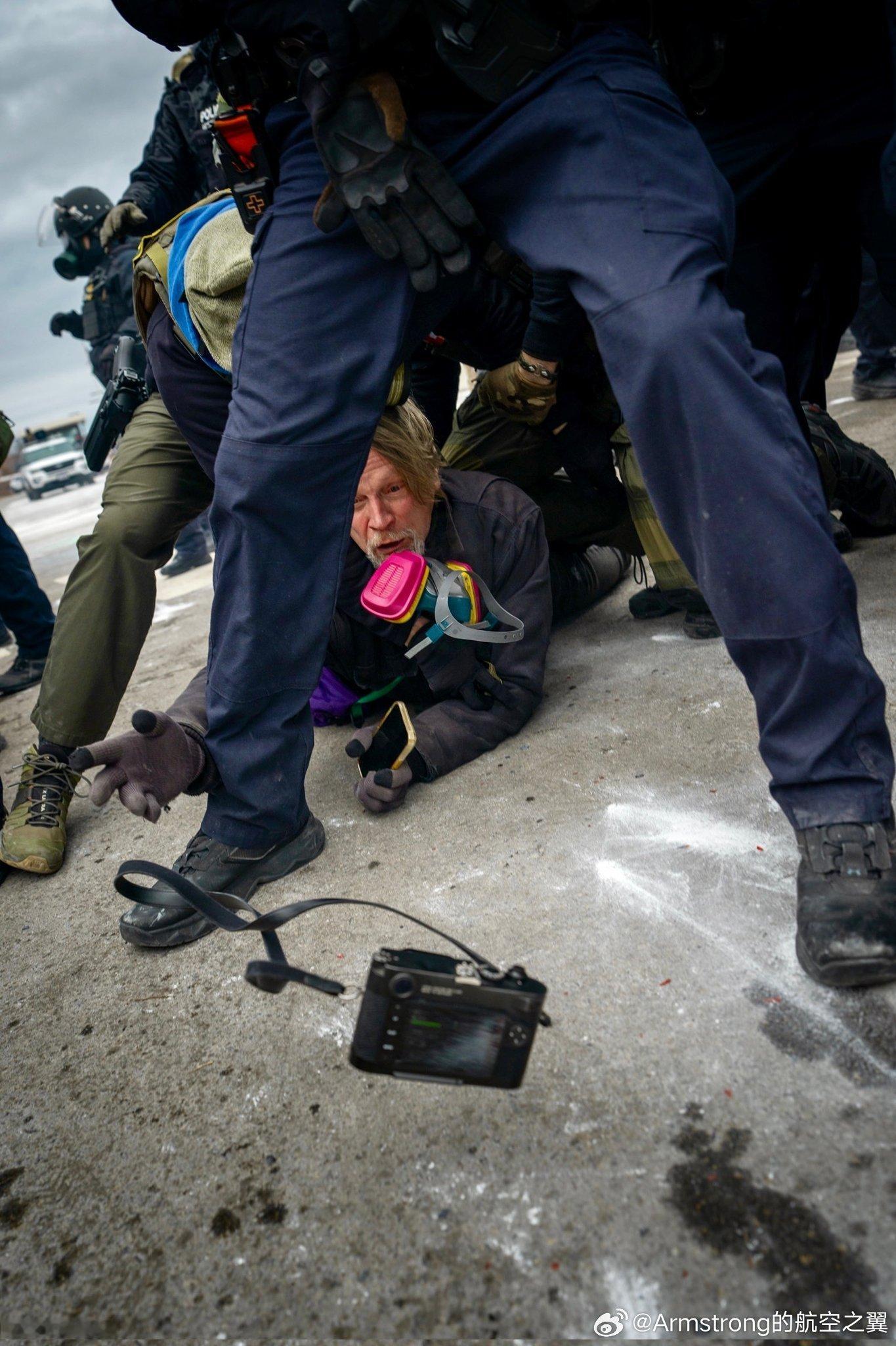 2026年1月15日,明尼阿波利斯抗议现场。独立纪实摄影师约翰· 阿伯纳西(John Abernathy)被ICE以莫须有罪名暴力逮捕,在倒下的瞬间将自己徕卡相机扔给附近的另一名摄影师,以保护相机内所记录的真相。