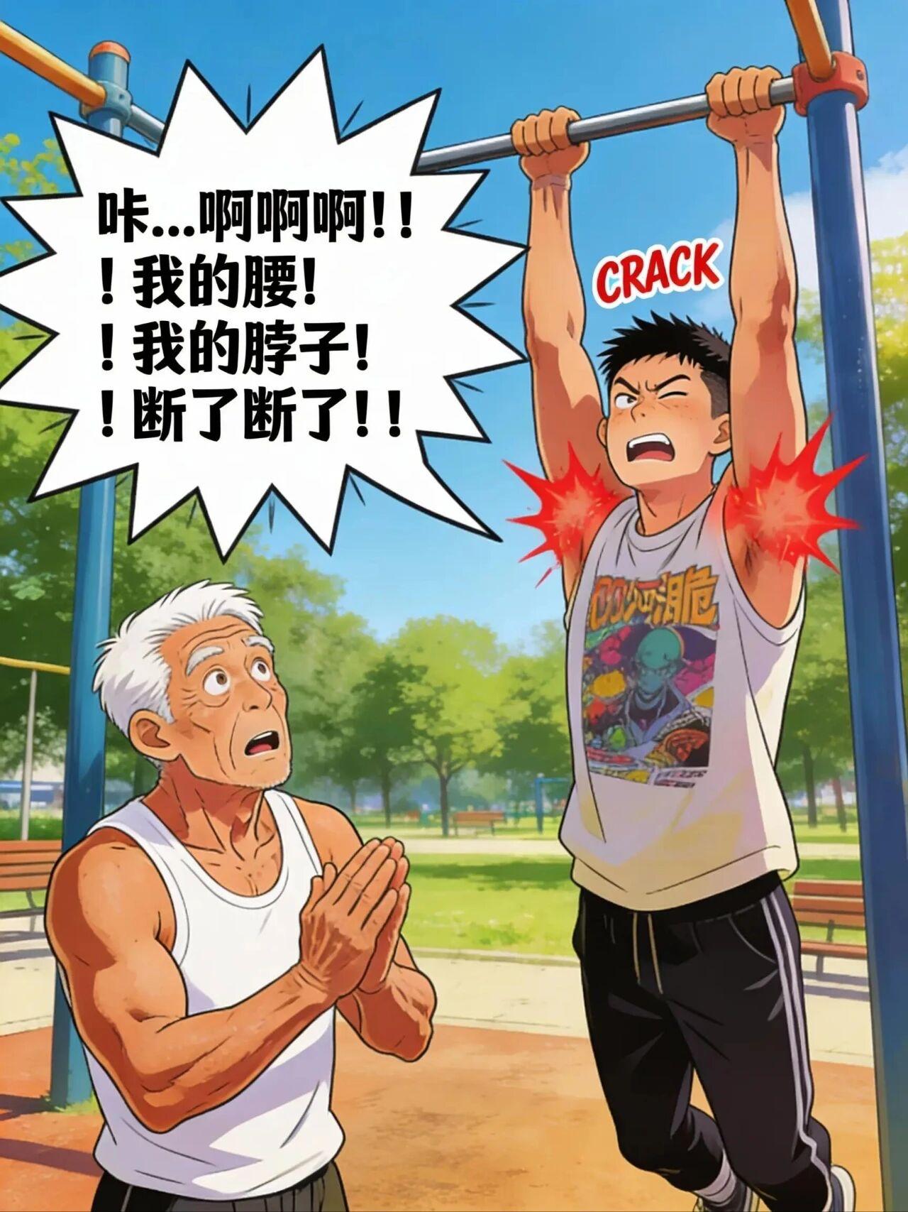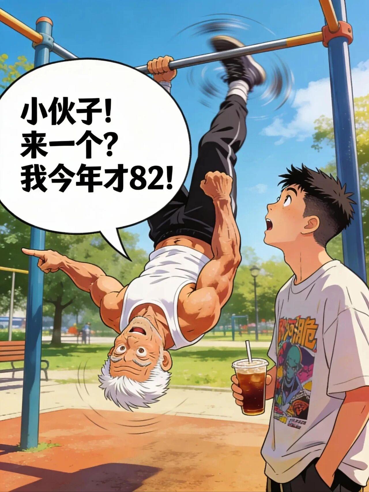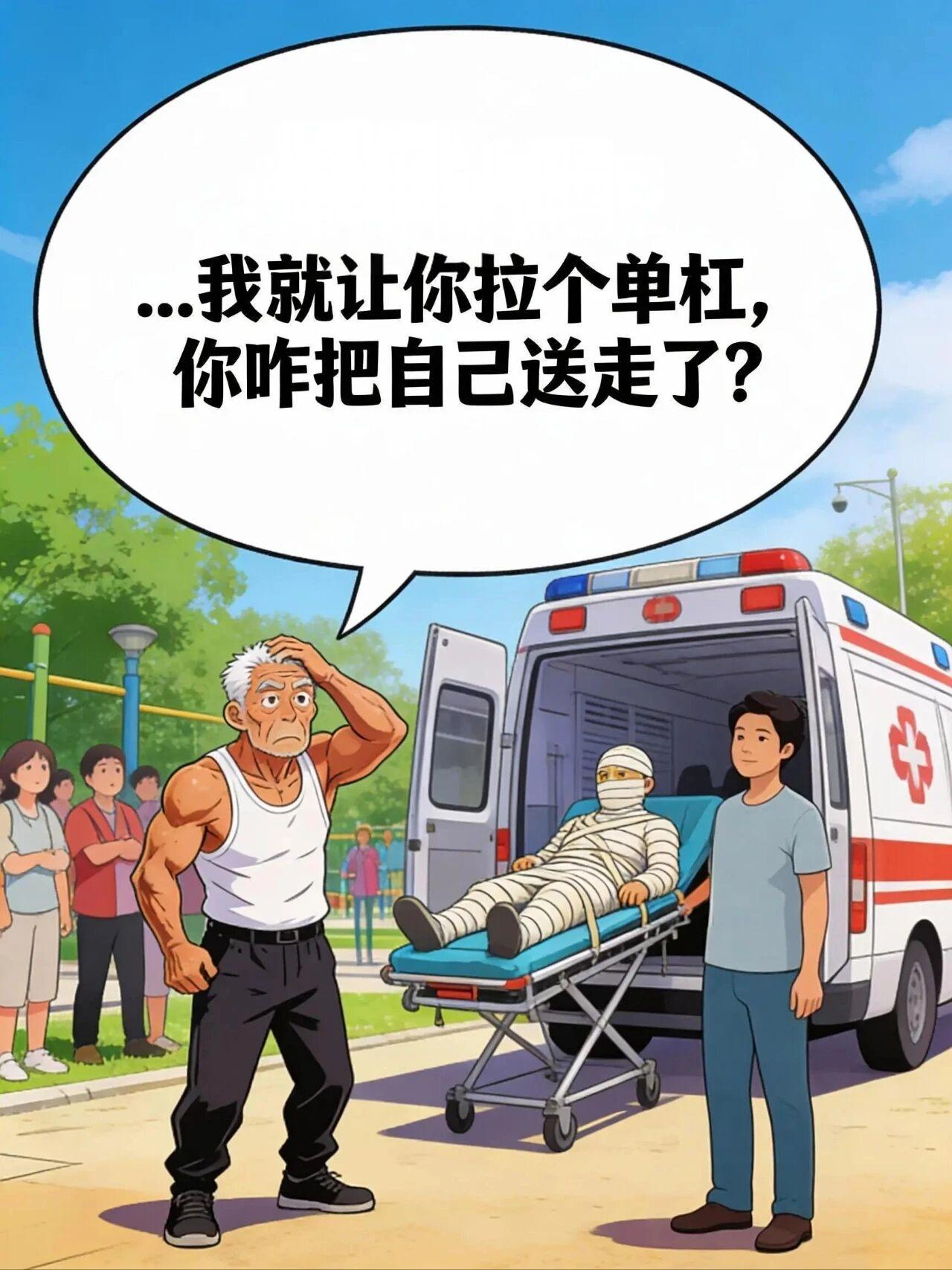 公园里的‘巅峰对决’ 大爷:小伙子!来一个?我今年才82! 阿脆:大爷您太小看我了!我才22,正是身体最好的时候!看我的! 阿脆:咔…啊啊啊!!我的腰!!我的脖子!!断了断了!! 大爷:我就让你拉个单杠,你咋把自己送走了? 阿脆:呜呜…这就是脆皮大学生的含金量……