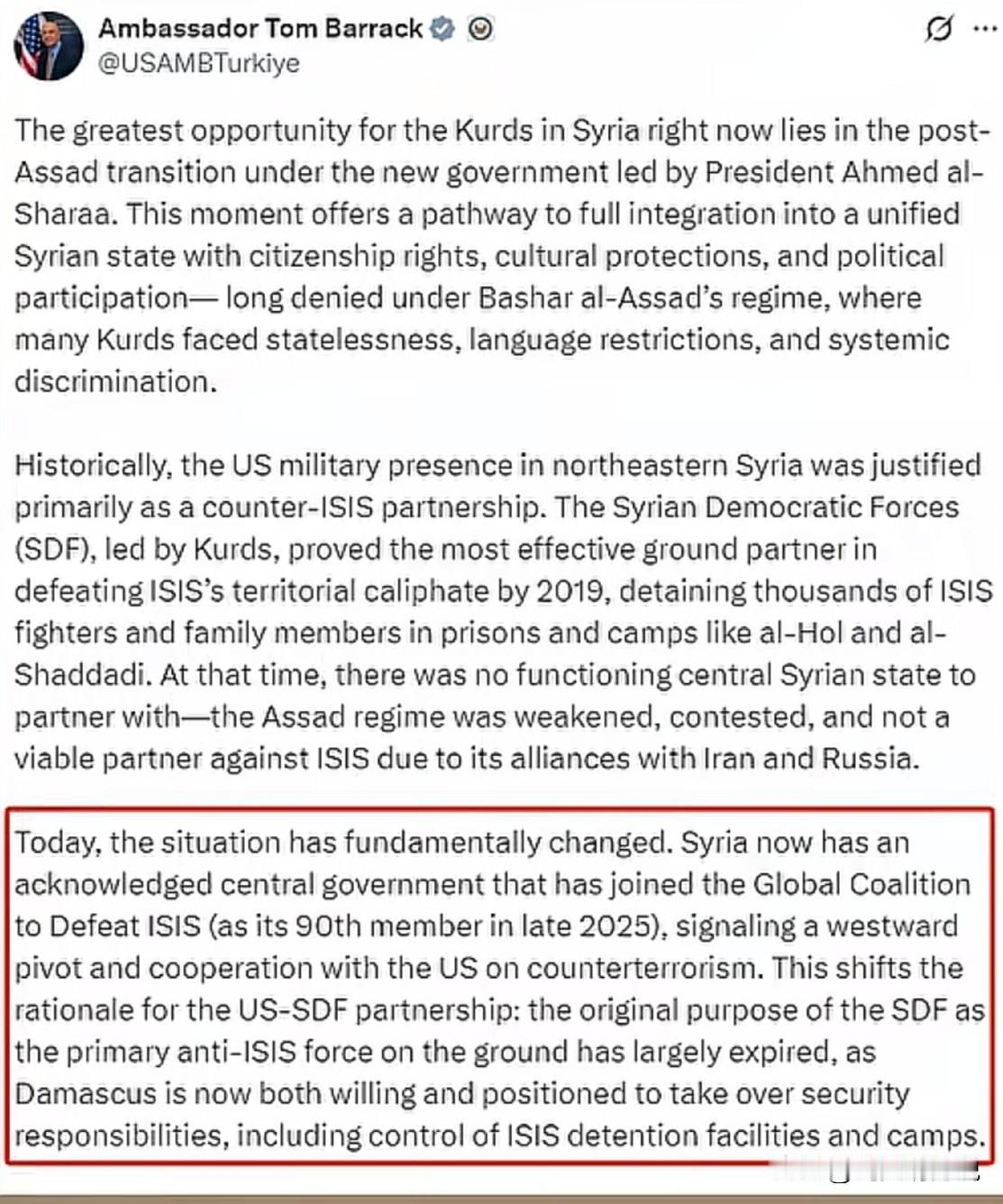 美国再一次的背叛了自己盟友,叙利亚库尔德人被背刺,不知道全世界与美国结盟有怎么感想,再想想我们的台湾突然笑了。 看美国把背叛库尔德人的锅摔的真干净,只能说美国驻土耳其大使馆发文说叙利亚库尔德人面临的最大机遇在于由艾哈迈德·沙拉总统领导的新政府主导的阿萨德政权倒台后的过渡时期。这一时刻为库尔德人全面融入一个统一的叙利亚国家提供了契机,他们有望获得公民权、文化保护权以及政治参与权—一而在巴沙尔·阿萨德政权统治下,这些权利长期遭到剥夺。阿萨德政权时期,许多库尔德人曾面临无国籍状态、语言限制以及系统性的歧视。 从历史上看,美国在叙利亚东北部的军事存在主要被归结为与打击伊斯兰国(ISIS)的合作关系。由库尔德人领导的叙利亚 民主力量(SDF)被证明是最为有效的地面合作伙伴,在2019年之前成功击退了ISIS的领土性哈里发国,并在诸如阿尔霍尔 和阿尔沙达迪等监狱和营地中羁押了数千名ISIS武装分子及其家属。当时,叙利亚境内并不存在一个正常运转的中央政权可 供合作——阿萨德政权已被削弱、处于纷争之中,且由于其与伊朗和俄罗斯的结盟关系,并非对抗ISIS的可行合作伙伴。 如今,形势已发生了根本性的转变。叙利亚现拥有一个得到公认的中央政府,并于2025年末正式加入全球打击伊斯兰国联盟(成为其第90个成员国),此举标志着其战略重心向西转移,并开始在反恐领域与美国展开合作。这一变化改变了美-SDF伙伴关系的基础逻辑:由于大马士革方面如今既具备意愿、也具备相应的条件来接管安全职责,包括控制ISIS 的拘押设施和营地,SDF作为地面主要反ISIS力量的原定目标已基本达成。 一大段话就是说巴沙尔管理叙利亚的时候美国只能选择库尔德人,现在美国有了更好的选择,你们没价值了,也是库尔德人活该,早在2019年巴沙尔就对库尔德人发出过的警告,他说“美国不会保护你们,不会把你们放在心里,也不会放在怀抱里,只会把你们放在口袋里,让你们成为讨价还价的工具。巴沙尔·阿萨德如令这番话似乎得到了完全应验。