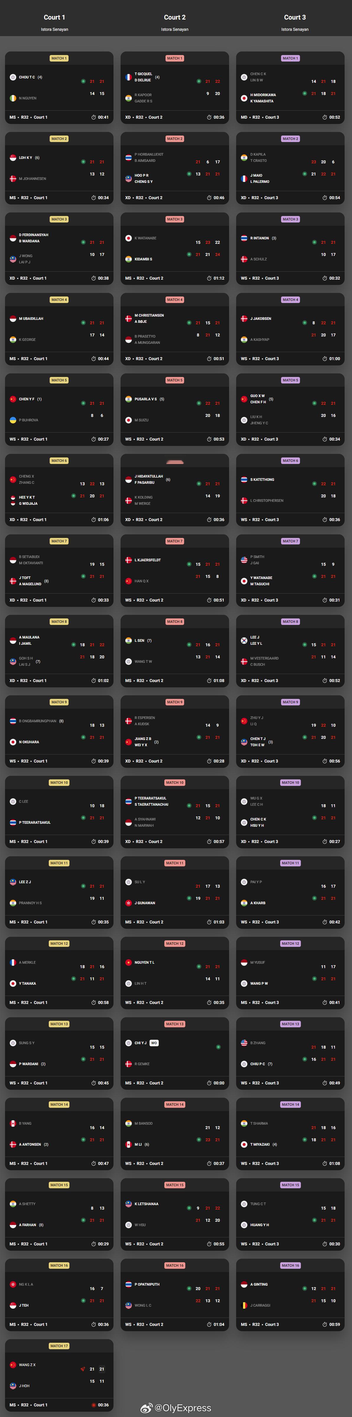 【印尼大师赛次日国羽4胜3负】2026年印尼羽毛球大师赛羽联超级赛 1月21日雅加达,2026世界羽联超级500印尼大师赛结束第二比赛日,国羽取得4胜3负战绩。国羽赛果如下,完全赛果见图:男单:王正行21-15/21-11贺首维(马来西亚)女单:陈雨菲21-8/21-6布赫罗娃(乌克兰)韩千禧21-15/15-21/8-21克亚尔斯菲尔德(丹麦)混双:郭新娃/陈芳卉22-20/21-16刘广珩/郑宇倢(中国台北)蒋振邦/魏雅欣21-14/21-9伊斯佩尔森/库德斯克(丹麦)程星/张驰13-21/22-20/13-21许咏凯/维德贾贾(新加坡/印尼)朱一珺/李茜19-21/22-20/10-21陈堂杰/杜依蔚(马来西亚)