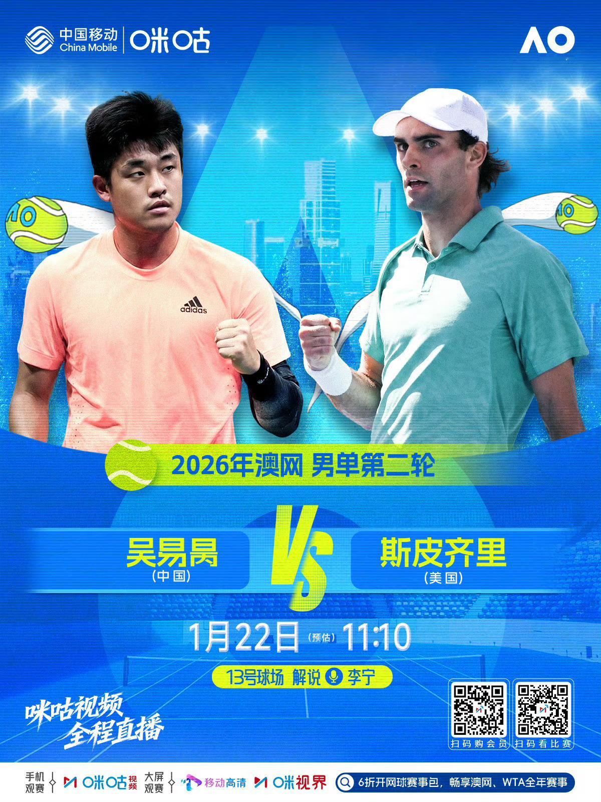 早上约11点,在解说澳网第二轮:吴易昺vs斯皮齐里阿昺已经在2026澳网连胜4场,26岁终于突破正赛首轮,第二轮的对手美国球员斯皮齐里刚刚淘汰了丰塞卡,是阿昺今年澳网面对的第三位美国球员。青少年时期也在美国练球的阿昺,对美式体系的打法相对熟悉,希望感冒不会有太多的影响,冲击首个澳网32强!8点先说一场卡恰诺夫vs巴萨瓦雷迪,卡大师vs印度裔斯坦福大学高材生澳网2026吴易昺vs斯皮齐里
