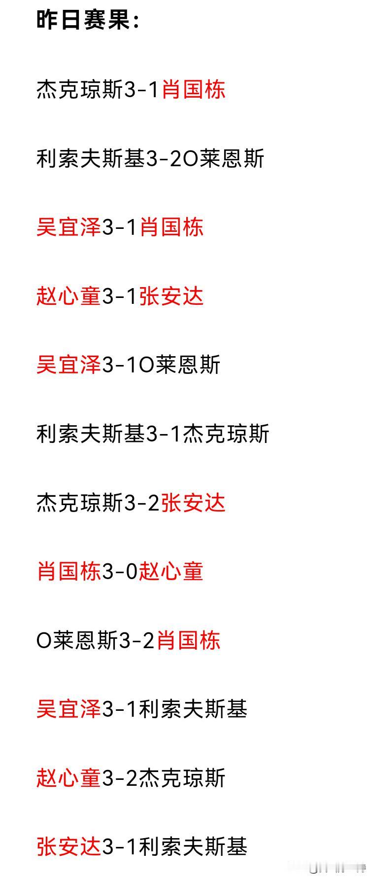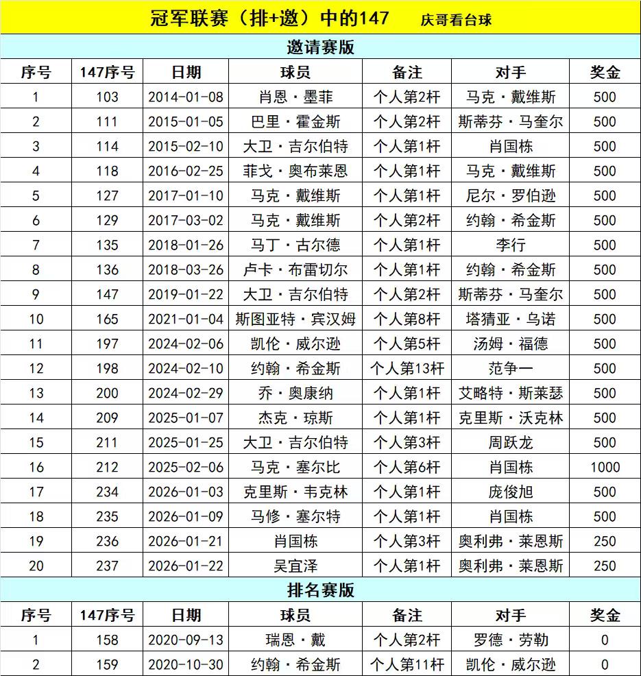 冠军联赛第6小组,肖国栋、吴宜泽打出两杆147,这是冠军联赛(邀请赛)历史上第20杆147,也是本次冠军联赛第4杆147,同时也是吴宜泽第1杆147。 第一阶段打完,吴宜泽暂时位于榜首,3战保持全胜。赵心童位于第4,输给肖国栋一场。肖国栋第五,输给吴宜泽和杰克琼斯,张安达第六。 肖国栋对阵莱恩斯打出147,结果却输了。吴宜泽也是对阵莱恩斯打出147。单杆最高奖是500英镑,目前有4个人分。 今天晚上,比赛继续赵心童对阵利索夫斯基等,敬请关注。