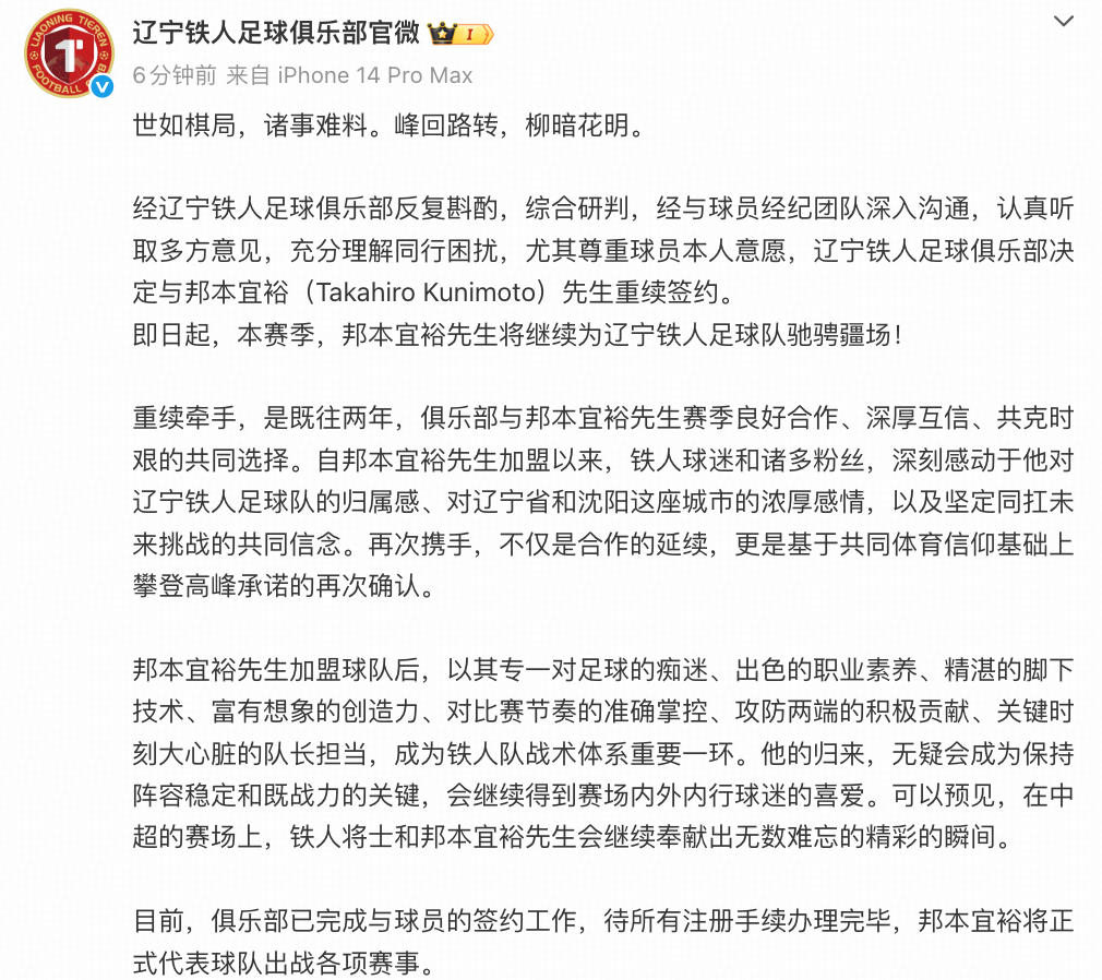 解释了原因,但好像又没有完全解释🤔宣布,邦本宜裕与俱乐部重新续约。让我们回顾一下过去几周发生了什么:1月9日,延边龙鼎宣布邦本宜裕加盟。辽宁铁人随后发布公告,表示尊重其经济团队选择,并对邦本宜裕送上祝福。几个小时后,延边龙鼎的官宣公告被删除,开始有传闻称转会可能出现反转。1月13日,消息称邦本宜裕接近于辽宁铁人续约。称,延边担心邦本的合同履约失败,俱乐部管理层联系辽宁铁人希望对方出面解决困局。 邦本宜裕重返辽宁铁人