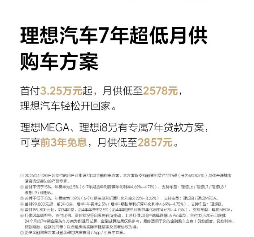 特斯拉开了个头,大伙都跟上了。理想、小米、小鹏都推出了 7 年低息方案,MEGA、i8 还叠加了前 3 年免息,月供不到 3000 块。汽车黑科技理想汽车