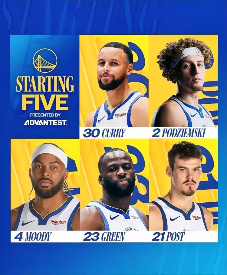 随着巴特勒赛季报销,勇士首发阵容变成3后卫+1大前+1中锋: 1、斯蒂芬·库里,后卫,37岁,身高1.88米,场均27.1分3.7篮板5.1助攻。 2、布兰丁·波杰姆斯基,后卫,22岁,身高1.93米,场均12.3分4.4篮板3.2助攻。 3、摩西·穆迪,后卫,23岁,身高1.96米,场均10.7分3篮板1.5助攻。 4、德雷蒙德·格林,前锋,35岁,身高1.98米,场均8.8分5.8篮板5.2助攻。 5、昆滕·波斯特,中锋,25岁,身高2.13米,场均8.1分4篮板1.4助攻。