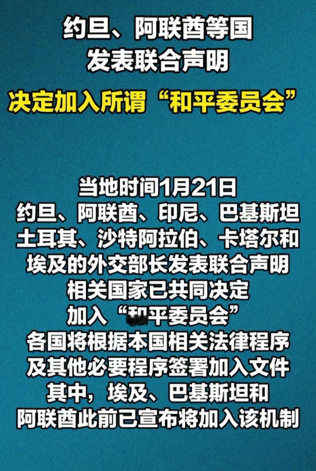 没跟中国打招呼,巴基斯坦又加入了特朗普和平委员会。网友:巴铁为啥加入美国阵营了! 据外媒报道,美国特朗普政府主导的“和平委员会”又迎来了一大波新成员,约旦、阿联酋、印尼、巴基斯坦、土耳其、沙特、卡塔尔、埃及这八个国家的外长一起发了联合声明,明确说要加入这个委员会,接下来就等着各自走完国内的法律程序,签正式的加入文件就行。这些曾经是一带一路的国家,现在又加入了这个组织,这可不是个小动静,要知道这八个国家里,中东国家占了一大半,还有印尼、巴基斯坦这样的区域大国,一下子集体表态,让这个刚成立没几天的机构瞬间有了不少“成员牌面”。 而在这八国之前,其实已经有不少国家早早点头同意加入了,以色列、阿根廷、匈牙利、白俄罗斯都在列,还有阿尔巴尼亚、巴林、摩洛哥,以及越南、哈萨克斯坦这些不同地区的国家,也都先一步表态支持这个机制。算下来,目前明确要加入或者已经同意加入的国家,覆盖了中东、欧洲、南美、亚洲等多个地区,阵容看着还挺庞大的。 加入还得交钱,为啥大家都愿意加入,其实各有各的实际考量。尤其是中东的这些国家,身处冲突漩涡,加沙的和平稳定直接关系到自己的国家安全,加入美国主导的这个委员会,既能拿到更多参与地区事务的外交话语权,还能分一杯地区战后重建的利益羹,同时也能靠着美国这个盟友,换一份安全承诺,巩固自家的政权稳定。可能以后加入的国家更多。 像匈牙利、白俄罗斯这类国家,要么和欧盟有分歧,要么在国际上面临外交压力,加入进来相当于找了个“靠山”,能缓解自身的外交困境。而阿根廷、越南这些新兴市场国家,更多是冲着经济利益来的,希望能靠表态加入,少受美国的关税、制裁这些打压,给自己的经济发展铺铺路。 特朗普为了自身利益,跨国抓总统,公海抢石油,抢货轮已经犯下滔天大罪,此时此刻还办所谓(和平委员会)还自封为永久主席。入会还要交钱,很多国家如此看不清形势,必将是待宰羊羔。目前只有我们看清形势,我们宁愿跟非洲黑人玩也不跟美国玩。 有网友认为,我希望白俄和俄罗斯都参加特朗普的和平委员会,中国决不参加,这样,中国守住稳坐联合国,俄罗斯交10亿美元,永久在和平委员会,特朗普才能活几年,未来世界一定是中俄的天下!不信走着瞧! 加入和平委员会,应该是平等的,不能正确处理国际事务,一国独大,各国没有发言权,提出不同意见,就有可能随时撤销会员資格,实际上是独霸世界。类似武侠电视一样,谁厉害谁就是武林盟主。从来不让弱者当武林盟主。 不过虽说现在加入的国家不少,但这个“和平委员会”从1月15日特朗普宣布成立起,争议就没断过。它不是联合国的下属机构,特朗普本人还终身担任主席,手握成员批准、决议否决的核心权力,甚至还搞了“付费入会”的规则,交10亿美金就能拿永久成员资格,被不少人吐槽是“把外交交易化”。而且特朗普还直言这个机构可能取代联合国,这种挑战现有国际治理框架的想法,也让不少国家对这个委员会的真正目的和实际作用,打了个大大的问号。 美国拖欠着联合国会费不付,自己却另立门户收别国会费,从交费转变为收费,这操作足够让全世界细细品味。