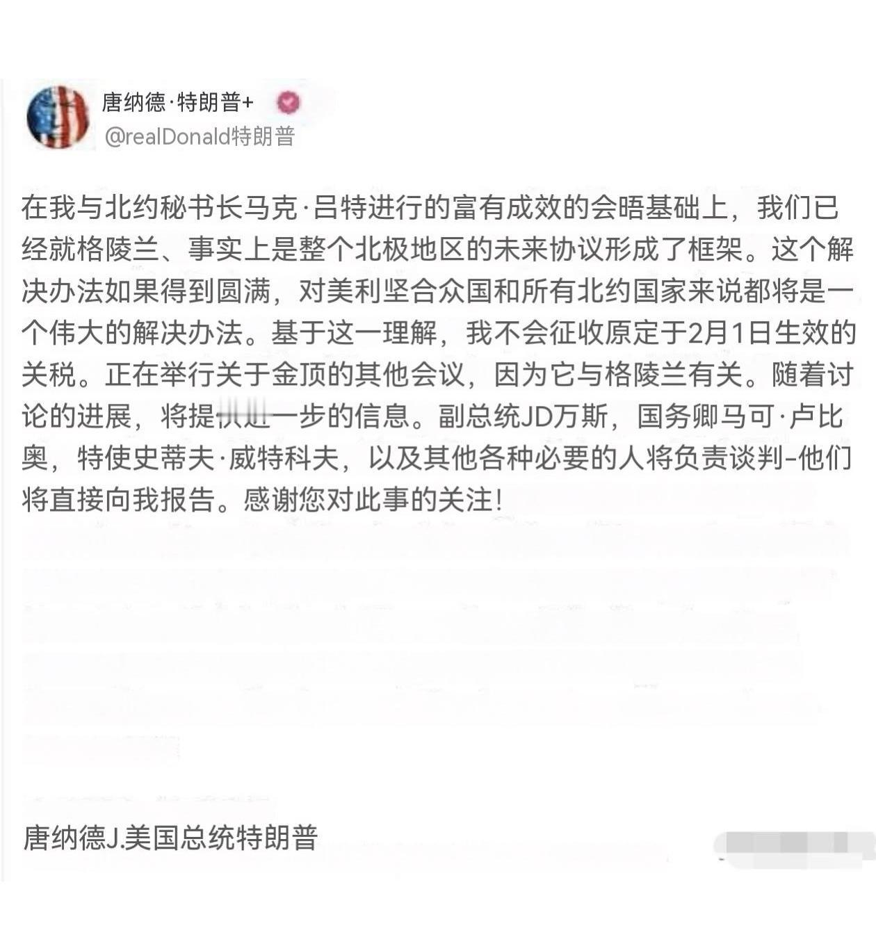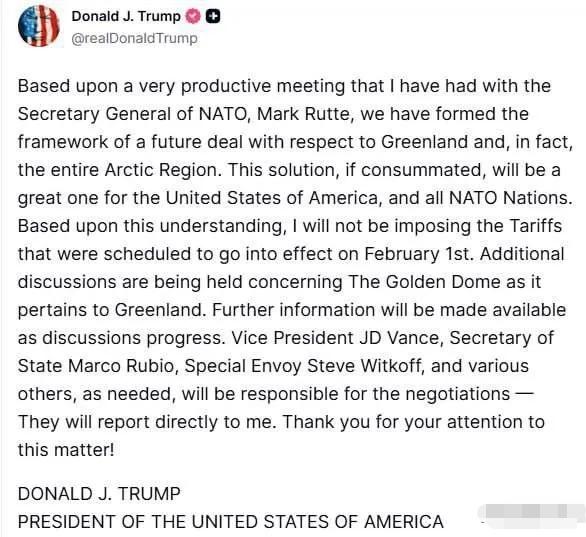 美国总统特朗普今天(1月22日)发文写道:“在我与北约秘书长马克.吕特进行的富有成效的会晤基础上,我们已经就格陵兰、事实上是整个北极地区的未来协议形成了框架。这个解决办法如果得到圆满落实,对美利坚合众国和所有北约国家来说都是一个伟大的解决办法。基于这一理解,我不会征收原定于2月1日生效的关税。正在举行的关于金顶的其他会议,因为它与格陵兰有关。随着讨论的进展,将提供进一步的信息。副总统JD万斯、国务卿马克.鲁比奥、特使史蒂夫.威特科夫以及其他人员将参加谈判,他们将直接向我报告。感谢您对此事的关注。” 特朗普今天在接受采访时进一步解释道,“这是一份长期协议,一份最终的长期协议,美国将永久掌控格陵兰岛,永久有效,没有任何时间限制,就是永远有效。美国将得偿所愿,收获到实打实的国家安全保障〞。 北约秘书长吕特今天在回应记者提问时,则否认与特朗普的会面中谈及格陵兰岛的主权归属。原北约秘书长、现丹麦外交大臣拉斯穆森对此回应称,自己愿意当面告诉美国总统特朗普,丹麦不会就格陵兰岛主权归属进行谈判,美国永远不会得到格陵兰岛,这是底线!