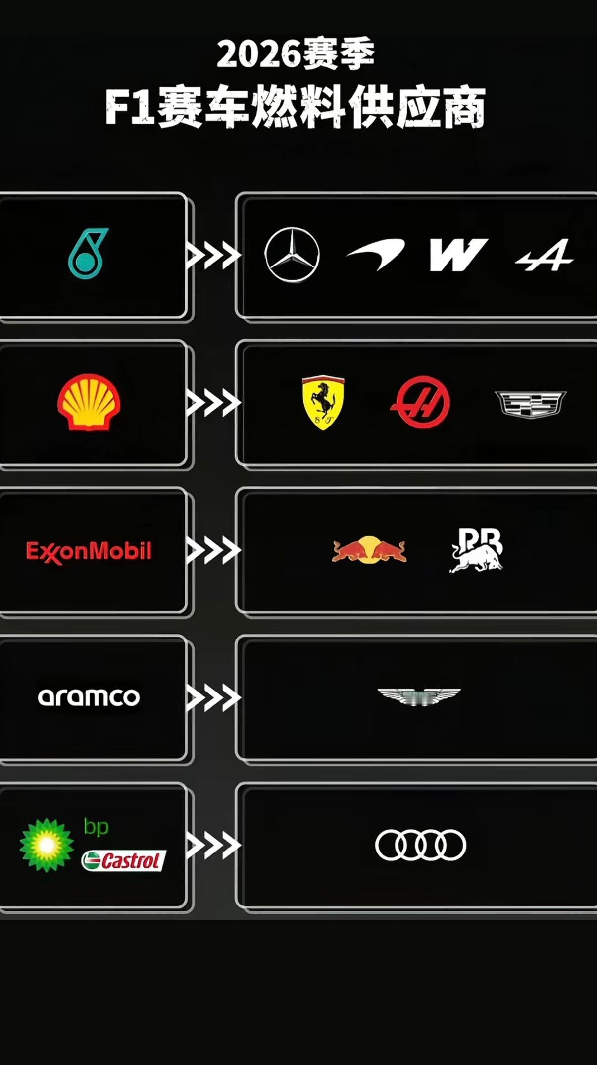2026年F1赛车燃料供应,奥迪上来就是自研引擎和独立供应。我宣布:获得新
