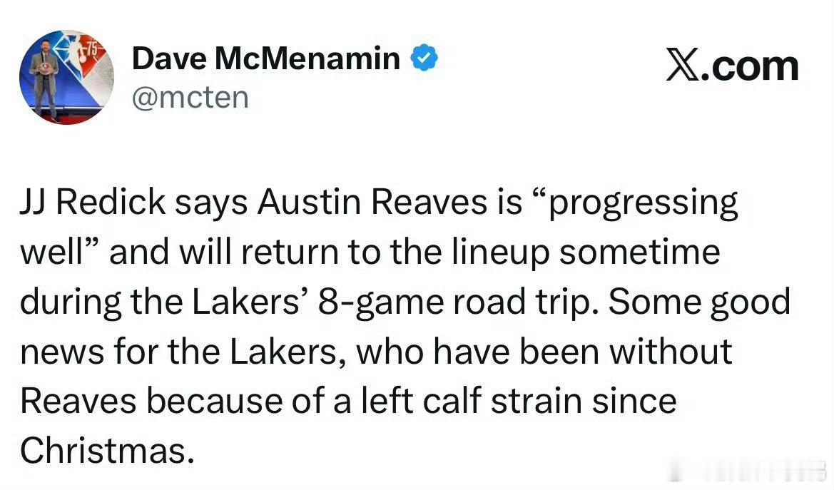 湖人快船明日伤病名单来了!就在刚刚湖人迎三条炸裂好消息!湖人这边——里夫斯(左小腿拉伤)、蒂耶罗(右膝扭伤)缺席!快船这边——伦纳德(左膝炎症)出战成疑!比尔 (左髋骨骨折 )、博格达诺维奇(左腿筋伤势管理)、小琼斯(右膝扭伤)、保罗(未随队)缺席!第一条好消息:里夫斯蒂耶罗明日继续缺席!而根据雷迪克最新透露,他说里夫斯目前恢复状态良好,有望在8连客之旅中迎来复出!太好了!里夫斯在本赛季一直超负荷打球,在此前对阵火箭那场比赛他左下腿拉伤彻底倒下!目前已经连续缺席13场比赛,在这13场比赛里,湖人取得7胜6负。第二条好消息:伦纳德明日出战成疑!小卡在近期因为膝盖炎症,缺席了3场比赛,从12月底到1月份至今的小卡状态有多火爆,球迷们有目共睹!在这期间又连续砍高分以及多次单节暴走!本赛季至今他能拿到28.2分6.3篮板3.5助攻2.2抢断,三项命中率也达到180俱乐部!所以他明日要是不打对湖人来说肯定是天大好消息!第三条好消息:艾顿在昨天对阵掘金,只打了14分钟就不慎被搓到眼睛被迫离场!而根据最新消息,艾顿没有在明日伤病名单中!洛杉矶湖人队艾顿詹姆斯湖人国度