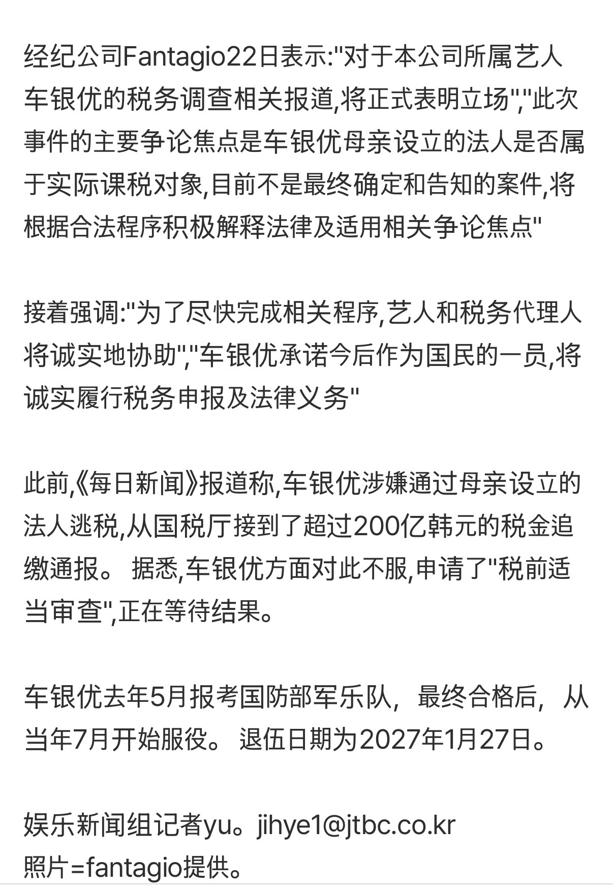 公司回应车银优涉嫌逃税车银优经纪公司发声明 车银优公司发表正式立场声明:“本次事件的核心争议在于车银优母亲设立的公司是否属于实际征税对象,目前相关事项尚未最终确定或下达正式通知。针对法律解释及适用相关的争议点,我们将依据合法程序积极进行说明。”“为促使相关程序尽快结束,艺人及税务代理人将积极配合税务部门”,并承诺:“车银优今后作为国民一员,将诚实履行税务申报及法律义务。”