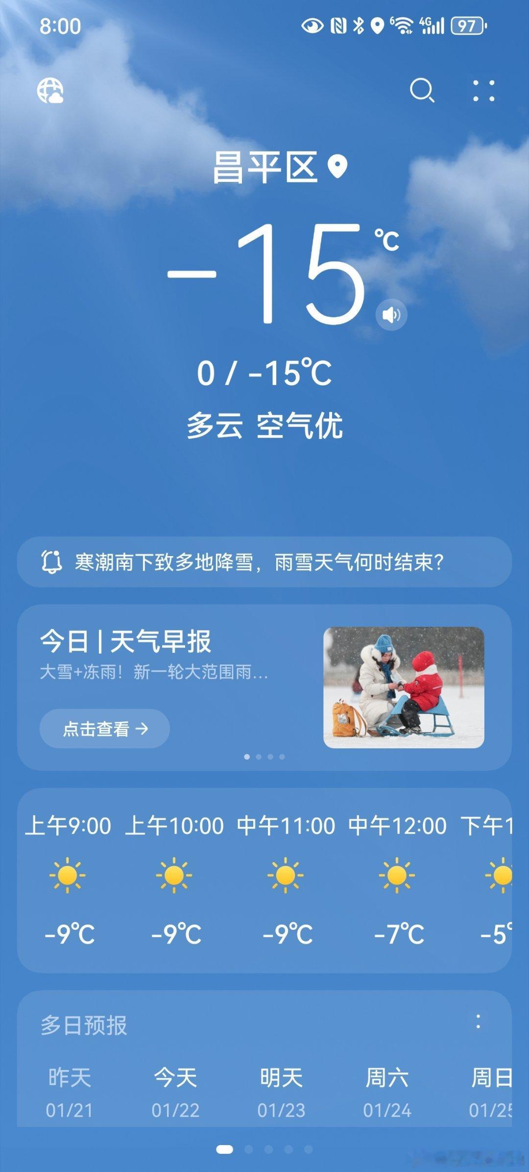 北京昌平低温零下15度太阳当头照,温度往下跳。此刻,室外零下15°。