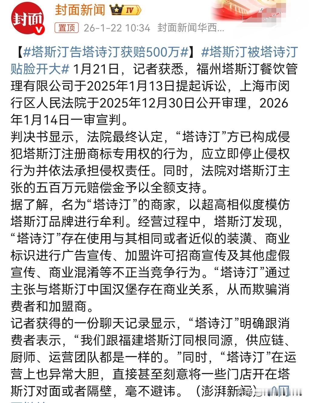 这个塔诗汀有多么的可恶啊,可以说是非常的嚣张。 有些门店竟然开在了塔斯汀的旁边。 很显然,塔诗汀就是侵犯了塔斯汀的权益啊。 这名字一看就是擦边塔斯汀啊。 而且还误导一些加盟商,说塔诗汀和塔斯汀存在关系。 这就让那些加盟的人信以为真了。 塔斯汀肯定不能坐视不管啊,就把塔诗汀给告了。 塔斯汀告塔诗汀获赔500万。 真是大快人心,敲响了警钟啊。
