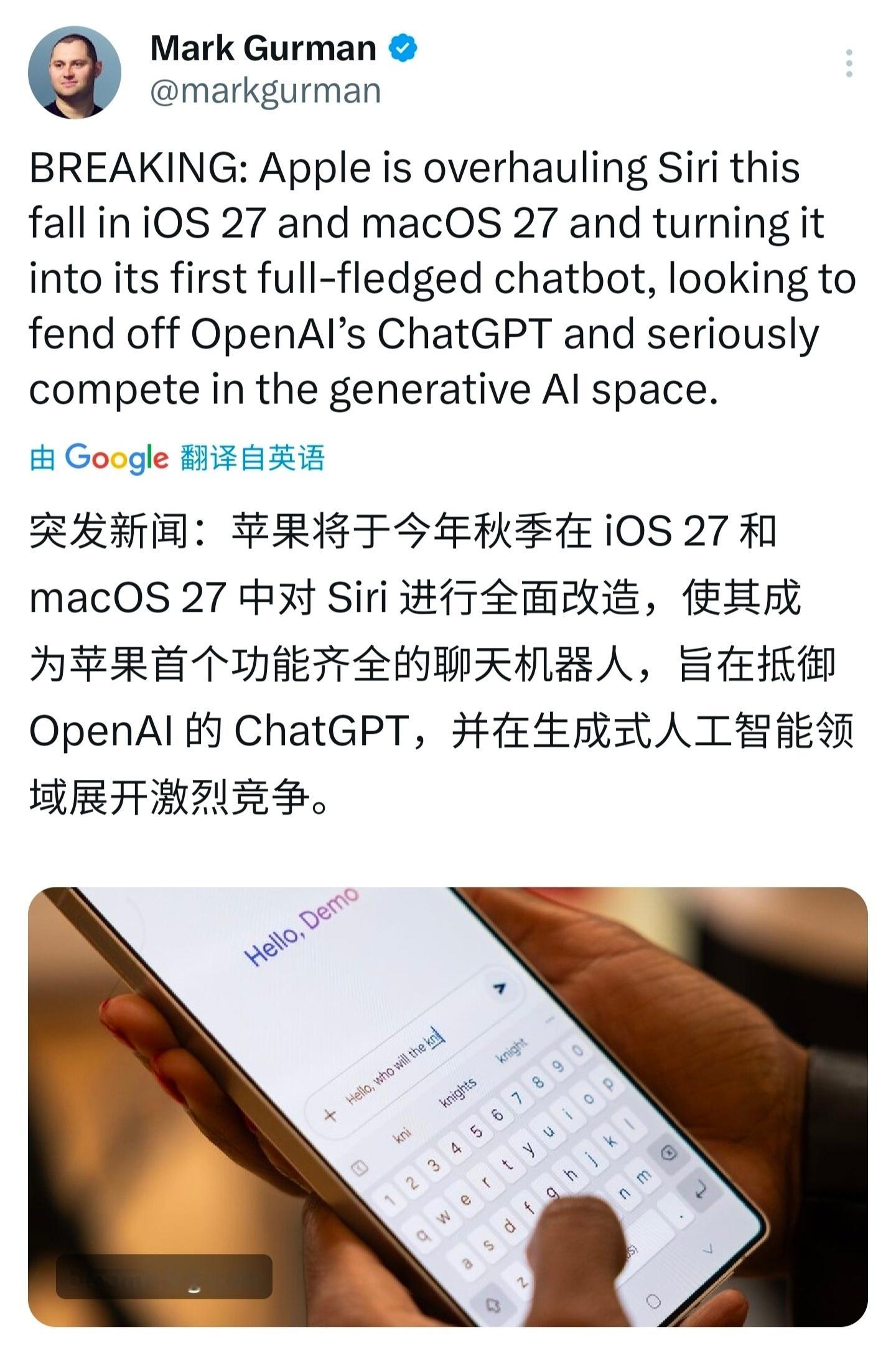 新资讯,苹果将在今年秋季对 iOS 27 和 macOS 27 中的 Siri 进行全面升级!Siri将转变为首款功能齐全的聊天机器人,主要是为了在人工智能领域展开有力竞争!
