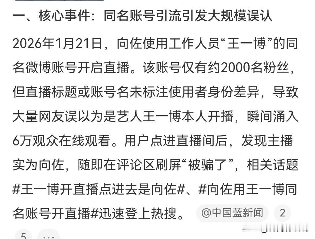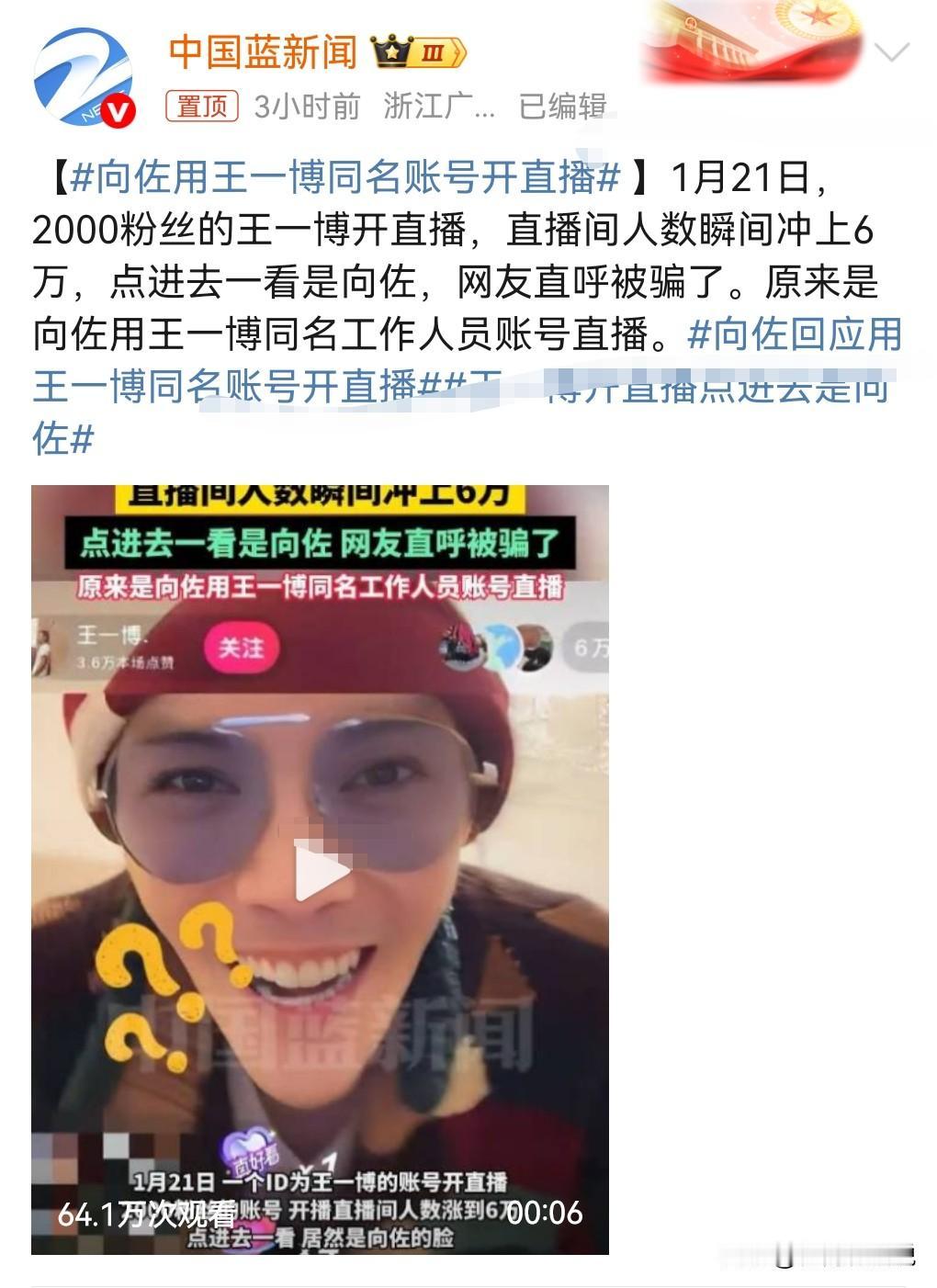 向佐又在搞花样了,又在耍小聪明了,不过可要悠着点啊,毕竟这种事情不会让网友们感到开心的。 别把好感越搞越差了。 1月21日,向佐用王一博同名账号开直播。 这个账号仅有2000名粉丝。 原来是他助理的。 很多人以为是大明星王一博,结果进去是向佐,而且直播间的人数一下就冲到了几万人。 很多人直呼被骗。 这种事情还是别干,可能会得到一点打赏钱,但是口碑会变差。