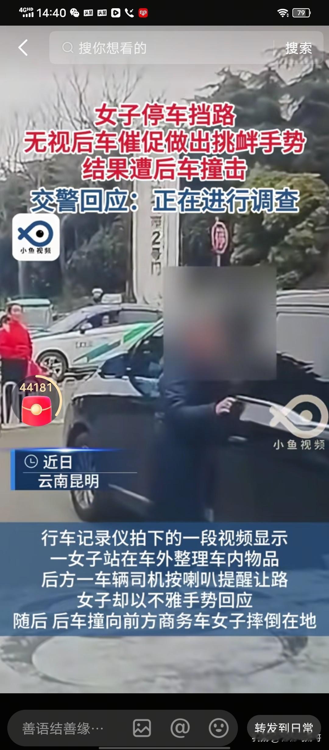 进入社会 , 还是要遵循文明的社会规则,因为社会不是你的家,不会像你的家人一样惯着你 ! 据小鱼视频发布,有一位女子将车停在道路中间,若无其事的整理车内的物品,这样就阻挡了后车的经过,后车按喇叭提醒她是不是应该将车靠在路边。 一般人见此情况都会为自己挡住了别人的路表示歉意 , 这个女子却不以为然 ,反而责怪别人按喇叭催促了她,向对方比手势做出挑衅动作 , 挑衅以后,继续站在车旁整理自己的东西, 分明挑衅对方我就不让你我就不理你你能把我怎么着? 没想到后车没有惯着她, 司机的路怒毛病上来了,一脚油门,车子就撞了上去来。 女子当即随着被撞车辆跌倒在地。 好在只是跌倒在地, 有惊无险。 可以说女子还算幸运, 躲过一劫。 万一对方的车不是撞车,直接冲人撞来,女子就会为自己的任性付出惨重代价 。 后车司机这种行为其实也是愚蠢,女子挡道,让交警来处理就行了;这么鲁莽的驾车撞上去,有理变无理,自己要承担全责,有可能还会受到法律的制裁 , 得不偿失。