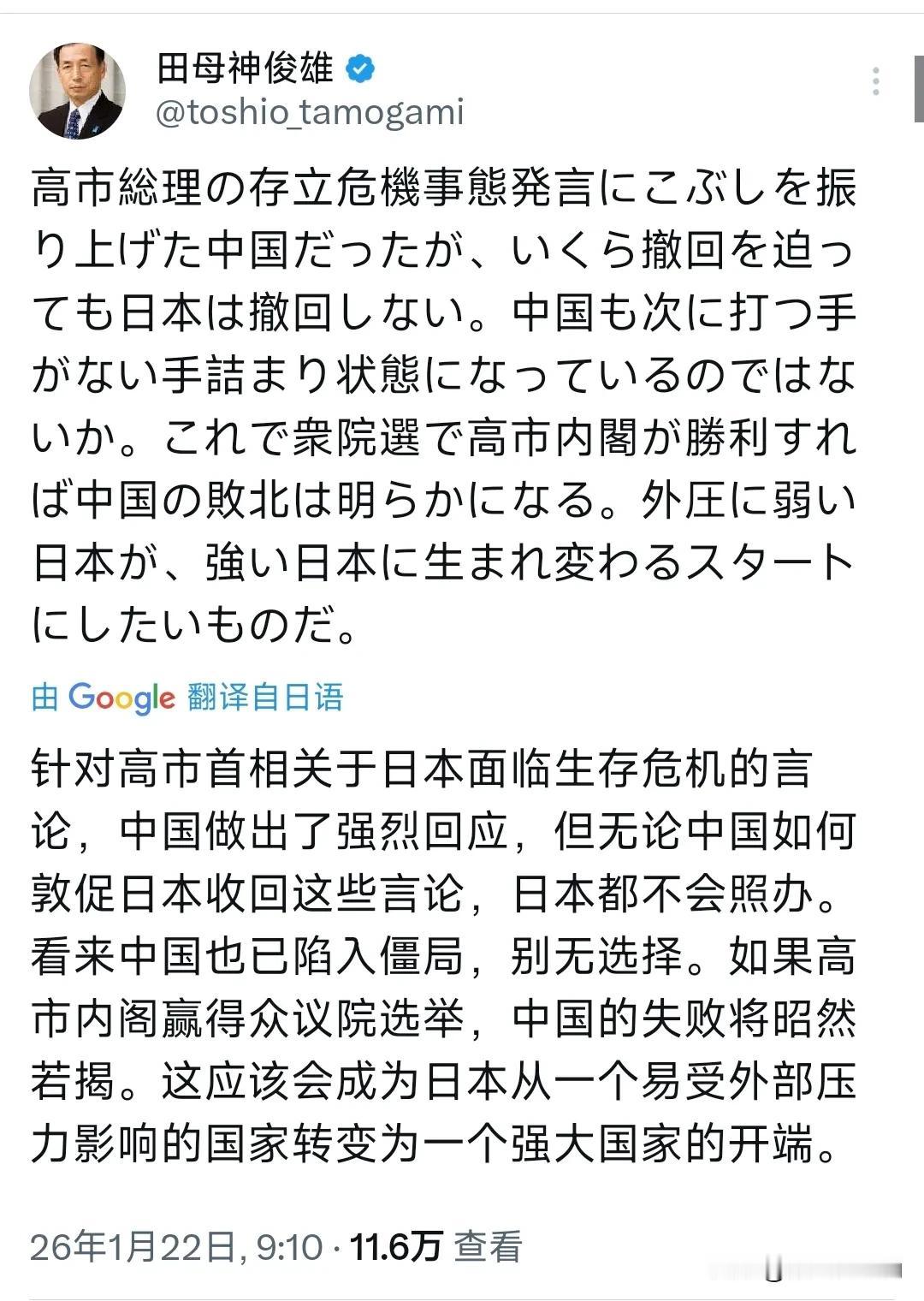 中国“无计可施”,日本将更加强大!日本极右翼分子田母神俊雄撂话声称,中国虽然对高市早苗首相的存亡危机事态发言挥动了拳头,但无论如何要求撤回,日本都不撤回。中国是不是也处于无计可施的状态呢?如果高市内阁在众议院选举中获胜,中国的“失败”就很明显了。希望这是一个让经不起外界压力的日本脱胎换骨成为强大日本的开端。 评几句 田母神俊雄的狂言,充其量是给中日关系添堵的噪音。中国手握反制工具却按兵不动,不是“无计可施”,而是“以时间换空间”——等待日本选民在选举中用选票告诉世界:一个靠煽动外部威胁续命的极右翼,拯救不了日本,只会把日本推向更深的战略泥潭。