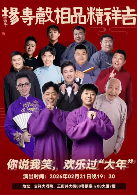 由康松广、靳佩良、宋德全、王文林、何沄伟、回想、路遥、董建春、李丁、李鸣宇等参加演出的吉祥精品相声专场,将于2月20日、21日在北京吉祥大戏院上演, 你说我笑,欢乐“过大年” 吉祥精品相声专场 2月20日晚 北京市·吉祥大戏院 主持人:李鸣宇 1、邱延龙、周广昊《歪唱数来宝》 2、张嘉桐、侯振鹏《学评书》 3、刘钊、孙超《洗澡洗澡》 4、宋德全、王文林《名胜游》 5、康松广、靳佩良《说名道姓》 6、何沄伟、吕嘉强《杂学唱》 2月21日晚 北京市·吉祥大戏院 主持人:张嘉桐 1、邱延龙、周广昊《洋药方》 2、辛明璋、高明菲《大闹空城计》 3、李涵、宋伟杰《新唱数来宝》 4、回想、路遥《整容日记》 5、李鸣宇、王文林《高山求子》 6、董建春、李丁《赤壁小话》