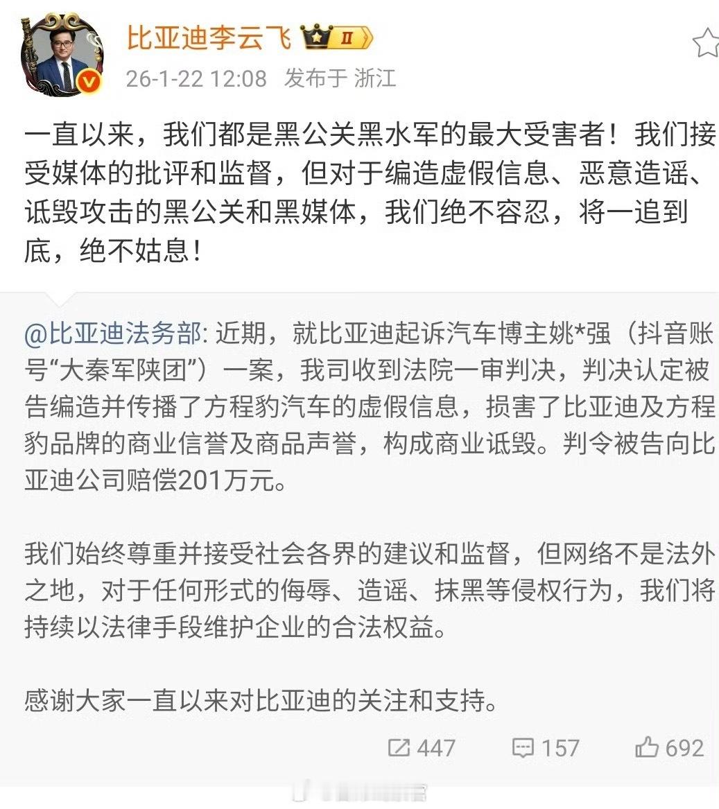 李云飞:一直以来,比亚迪都是黑公关、黑水军的最大受害者。比亚迪308_IO新能源汽车