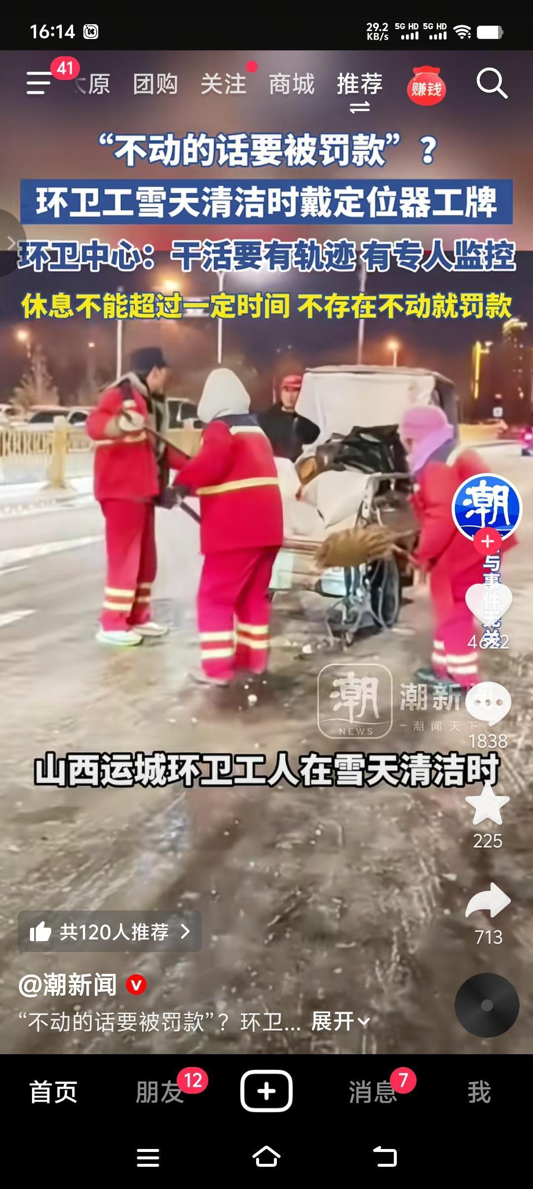 环卫工戴定位器工牌,不是怕你离岗,更不是怕你走失,而是干活时怕你偷懒。 1月19号,山西运城环卫工人在雪天清洁时,有网友暖心询问“这么冷的天不歇歇吗”?环卫工回应“身上有定位器,不动的话就要被罚款”。 高端仪器用在最底层人身上,把人当机器用,真是人才啊!一个月拿上万元工资,坐在办公室,喝着茶,吹着空调,看着电脑,随时监视着每一位环卫工人的劳动情况。画面一转,每个月拿着2000块钱的环卫工人,起早贪黑,每天穿梭在大街小巷。真是一个编在内,一个编制外,仿佛就是两个世界。