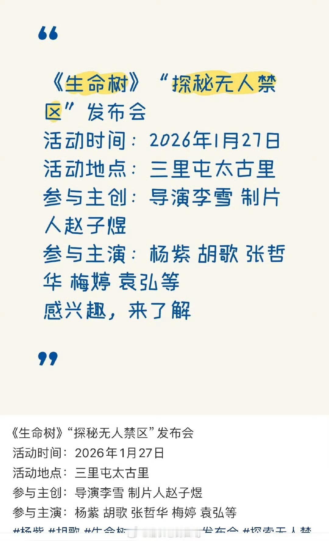 杨紫《生命树》1月27日有北京线下剧宣