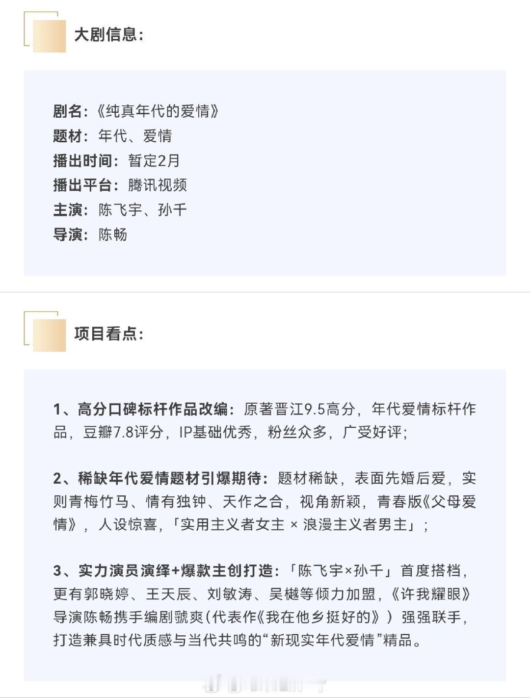 陈飞宇、孙千《纯真年代的爱情》播前招商,预计2月中旬腾讯视频开播