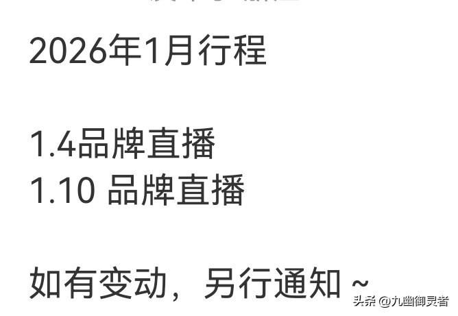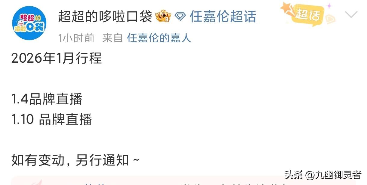 任嘉伦最新消息重磅来袭[比心][比心] 任嘉伦2026年1月份最新行程⬇️⬇️ 1月4号:品牌直播 1月10号:品牌直播 哇塞,这个工作狂都不带休息的吗[偷笑][偷笑][偷笑] 在12月31号,在各个平台 都是好几场晚会 1月份又是接连2场直播 果然是争分夺秒的任嘉伦[笑哭][笑哭] 虽然说,1月份就只有2个行程 但是,也挺好的,那就好好休息 (但你也不一定会休息,哈哈) 任嘉伦 任嘉伦最新动态