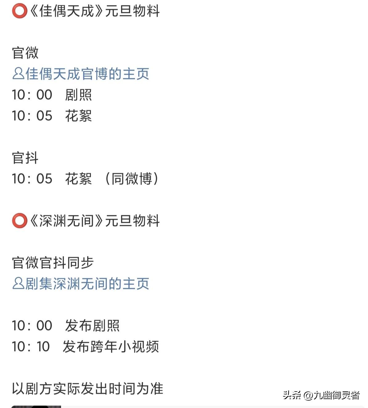 任嘉伦最新消息[比心][比心][比心] 刚刚接到超超的哆啦口袋通知 2026年1月1号上午有物料发放⬇️⬇️⬇️ 佳偶天成元旦物料 佳偶天成官博❤️❤️❤️ 10:00 剧照 10:05 花絮 官抖10:05 花絮(同微博) 深渊无间物料❤️❤️❤️ 官微官抖同步 10:00 剧照 10:10 发布跨年小视频 今天有嘉伦的跨年晚会 明天有嘉伦的新剧物料 嘉人们,提前过年了[大笑][大笑][大笑] 任嘉伦 任嘉伦最新动态