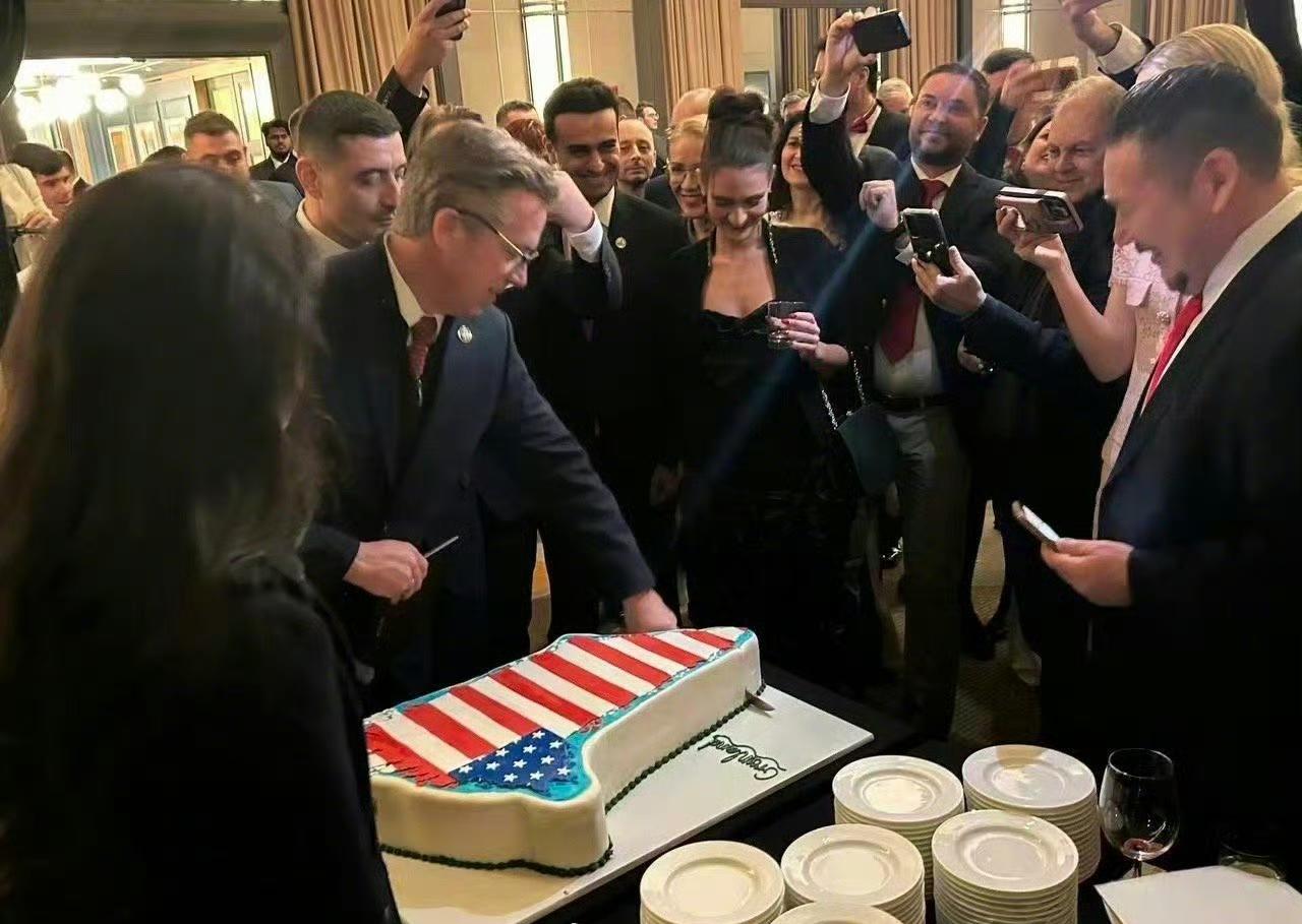 切格陵兰岛国旗蛋糕,野心直接摆上桌…… 美国共和党议员聚会玩出新花样:一块格陵兰岛形状的蛋糕,表面直接抹上美国国旗,一群人围着拍照欢呼。 这哪是切蛋糕,分明是把吞并格陵兰岛的野心摆到了台面上。 故岛被拒绝,如今换个方式“宣示主权”,吃相实在难看。 这蛋糕切完,下一步怕是要动真格了[狗头] 军事 国际