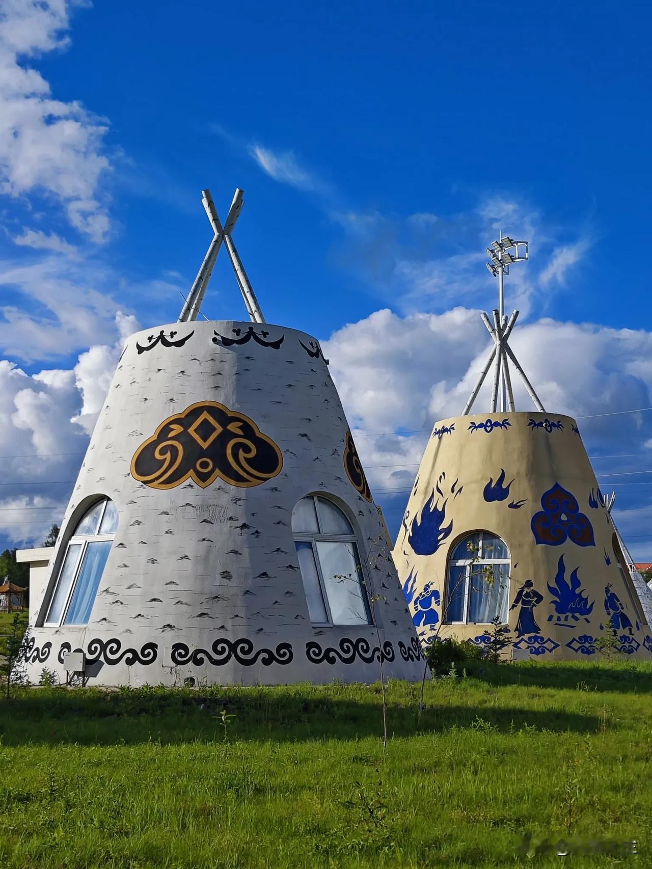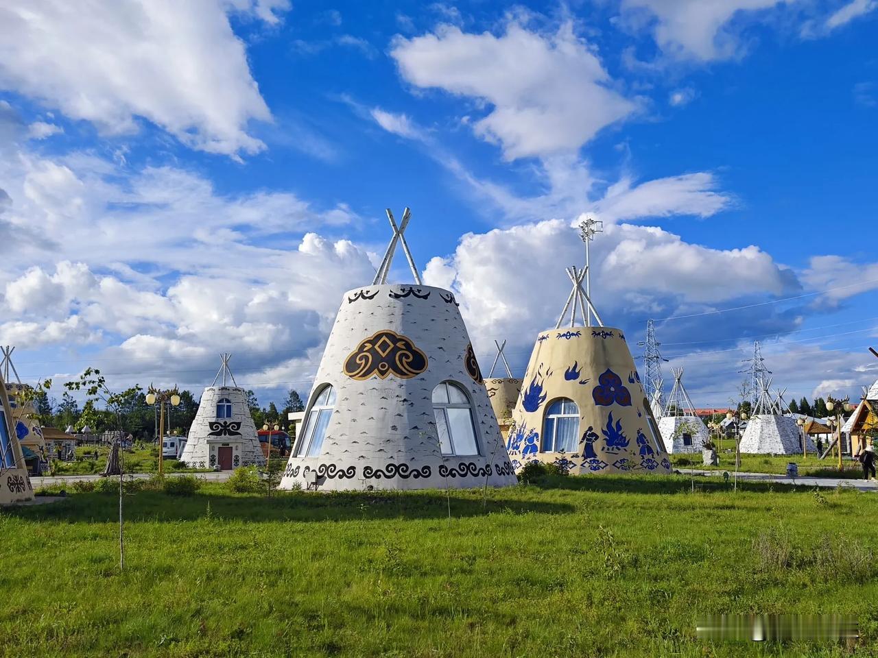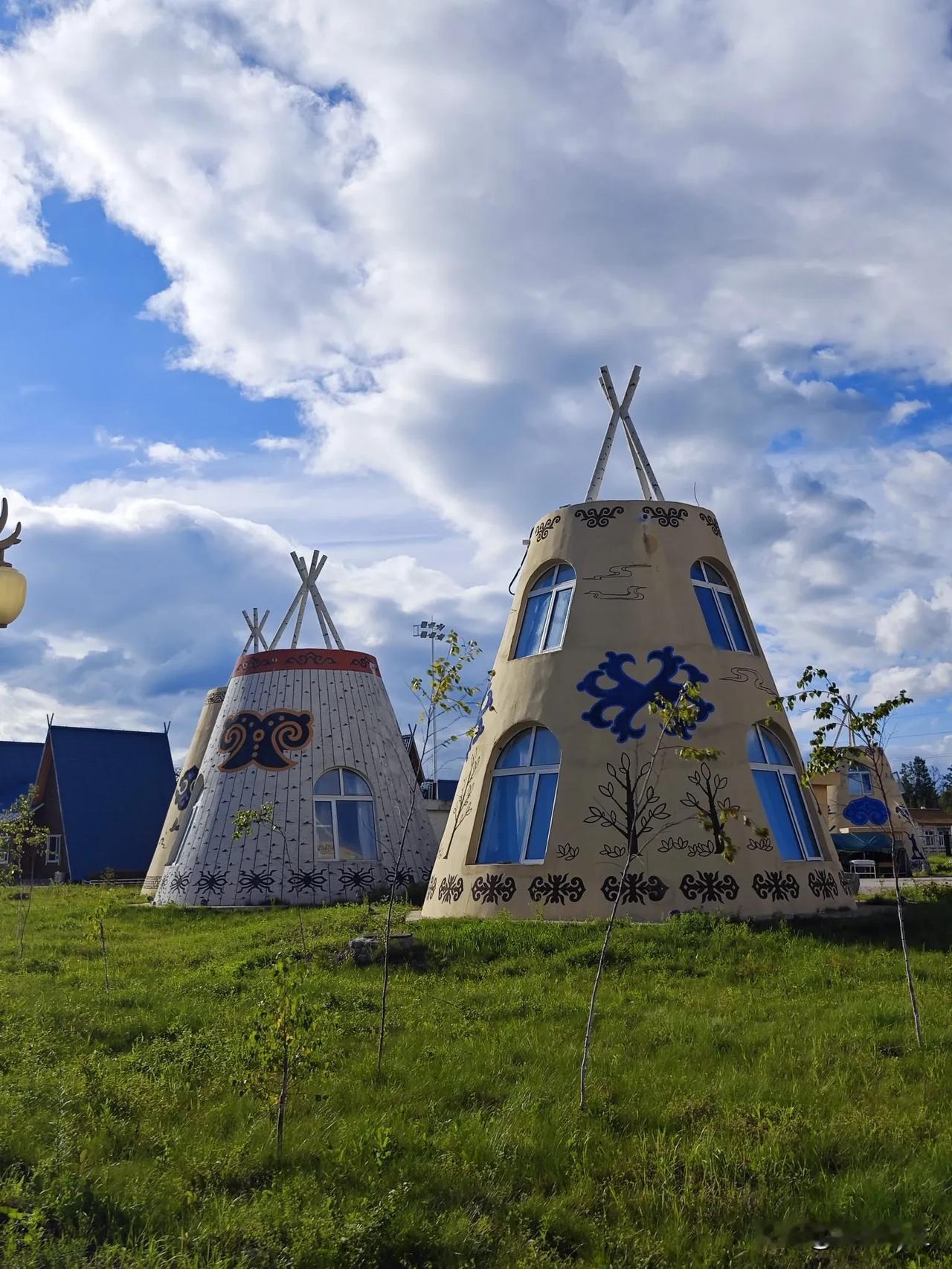 蓝天白云下的鄂伦春族民居,像一个个小城堡。