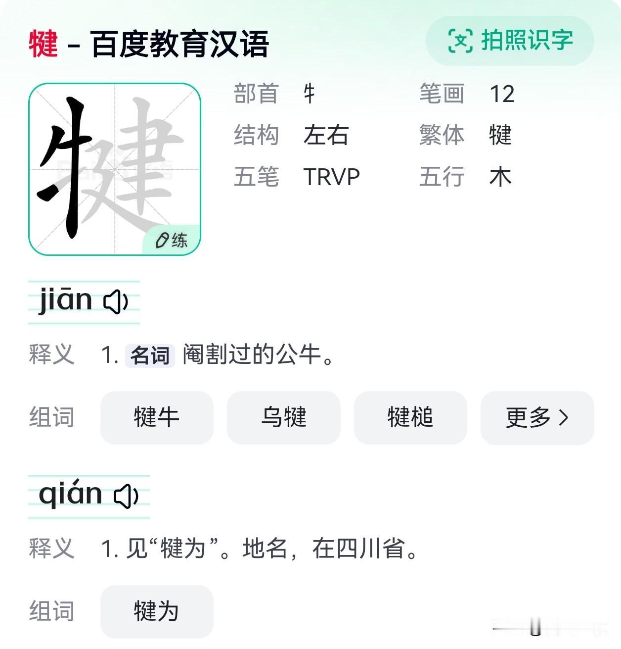 今天发现有个同事来自四川犍为,我说犍应该是壮牛,你太瘦了,不像。键我读jian(见)。同事乐了,他说首先,这字念qian(前),跟牛没关系;其次,就算它用来表示牛时,也不读4声,而是一声(坚)。哈哈,尴尬了! 犍为的名字源于西汉。汉武帝设立楗为郡,这里的楗是木字旁,是“屏障、门栓”的意思,楗为就是在西南地区设立屏障的意思。但楗字不常用,后来逐渐改成牛字边了,不过保持了读音。
