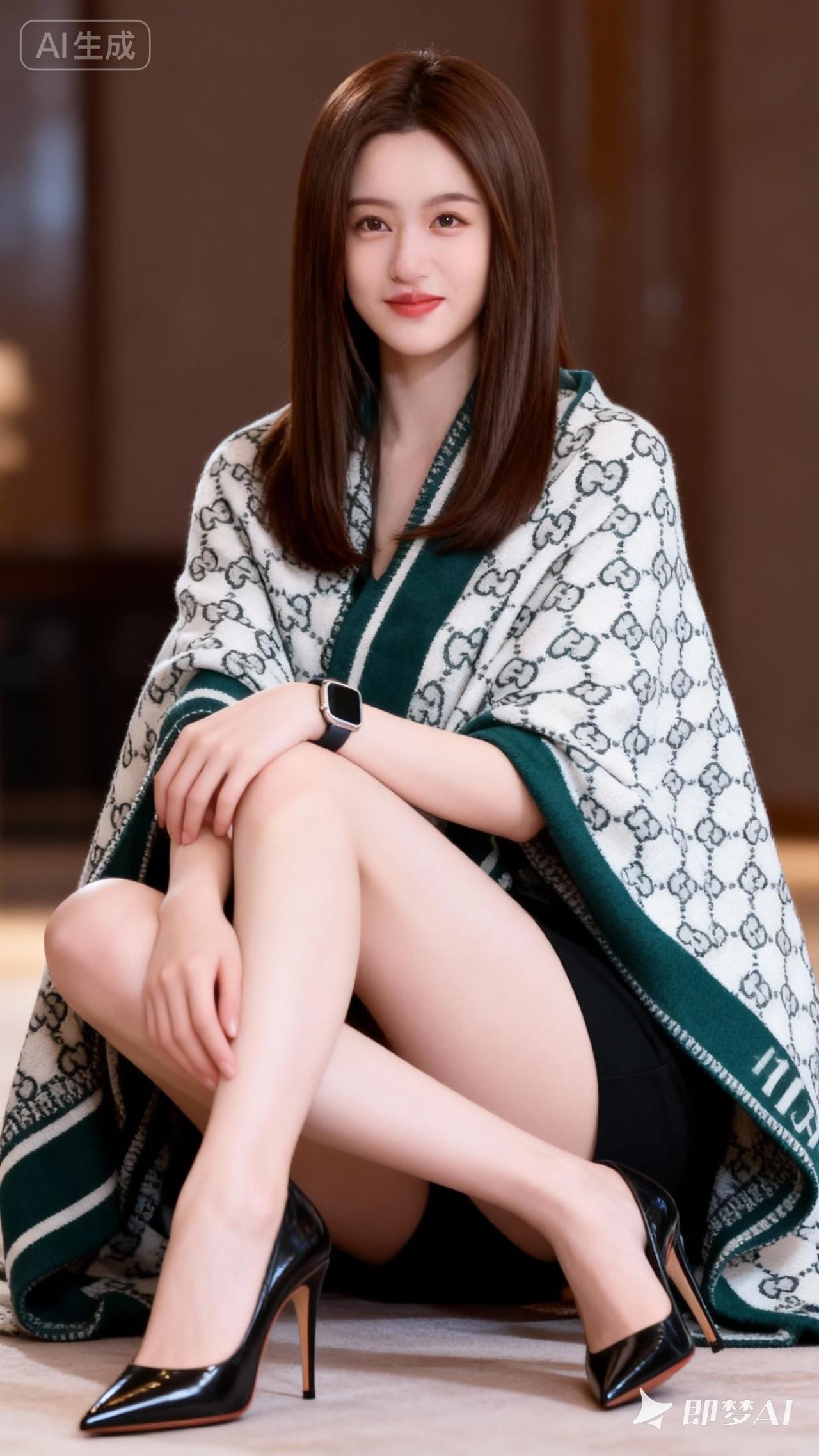 优雅气质,绿白相间披肩,时尚高跟鞋,尽显都市女性魅力。