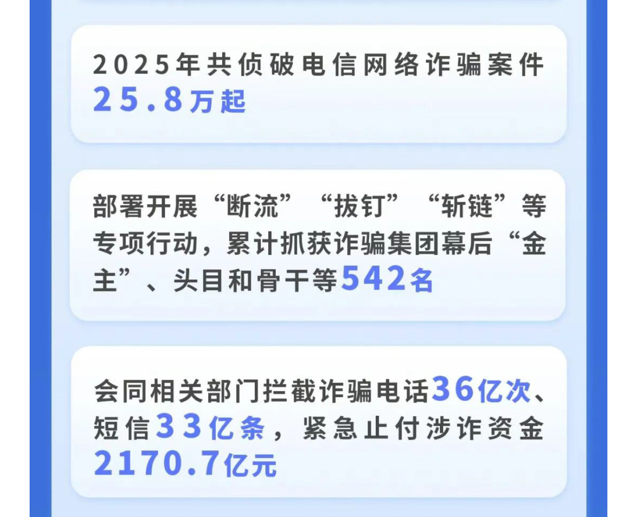 反诈工作有多难,这个数据可见一斑官方公布的数据:2025年共侦破电信网络诈骗案件25.8万起部署开展"断流""拔钉""斩链"等专项行动,累计抓获诈骗集团幕后"金主",头目和骨干等542名会同相关部门拦截诈骗电话36亿次,短信33亿条,紧急止付涉诈资金2170.7亿元