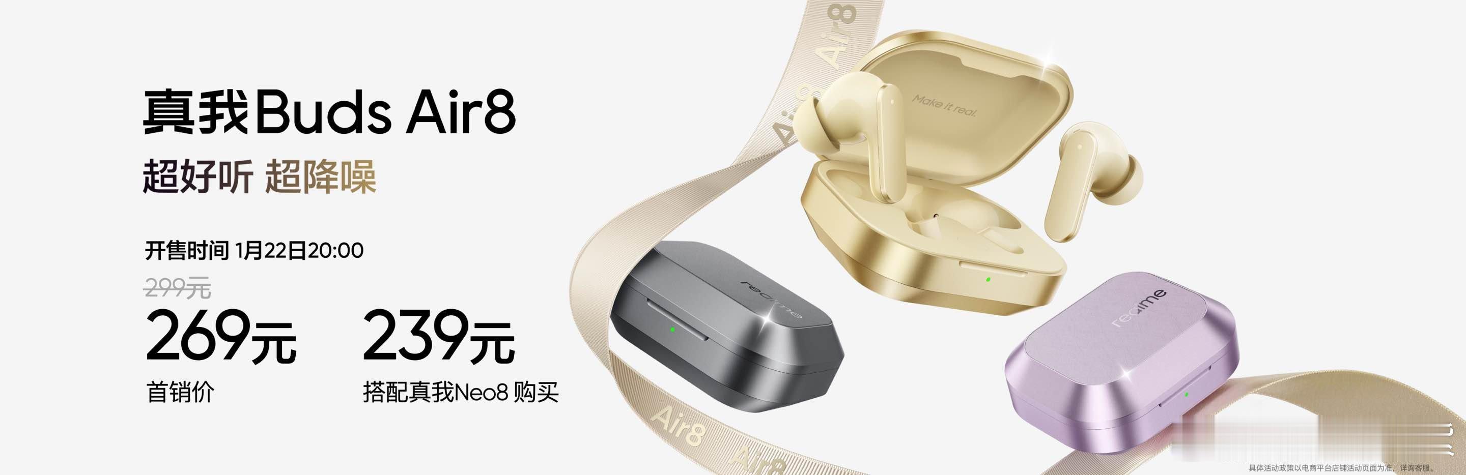 这次除了真我Neo8,还有一款耳机发布~是超好听 超降噪的真我Buds Air8!【大师质感】 大师金/大师紫/大师灰三色,生物基有机硅皮质+金属漆涂层【旗舰音质】 11mm+6mm分频双单元,LHDC 5.0+Hi-Res小金标认证,品质认证,音质大师 【降噪】 55dB超深降噪,5000Hz超宽频宽, 支持耳道自适应+六麦通话降噪 【AI赋能】 支持30种语言实时互译,你的随身翻译官【全能体验】58小时超长续航、IP55防尘防水、45ms低延迟、三设备互联,电脑秒连,随时随地畅玩无阻真我Buds Air8首销价269元,搭Neo8买只要239元!这波羊毛不薅就亏大了!