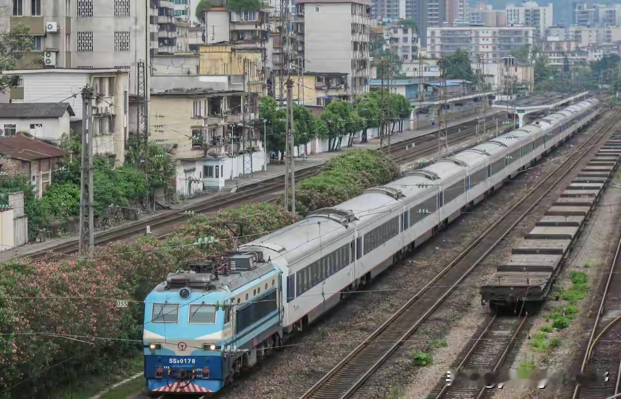 当年的韶山8电力机车牵引原色25t直特列车通过。在普速列车时代,25t客车的颜值非常的高。白色车体,深蓝色车窗色带,配上红紫色的裙边色带,让整节车体呈现出一种豪华高档的感觉。当年直特列车主要是由东风11g内燃机车和韶山9G电力机车牵引,最高运行速度能达到160km/h。韶山8电力机车虽然是准高速机车,但小的身材牵引长列,还是显得有些力不从心。但不管怎么说,这一幕都是非常经典的搭配。现在也几乎不可能再见到这样的场景了。