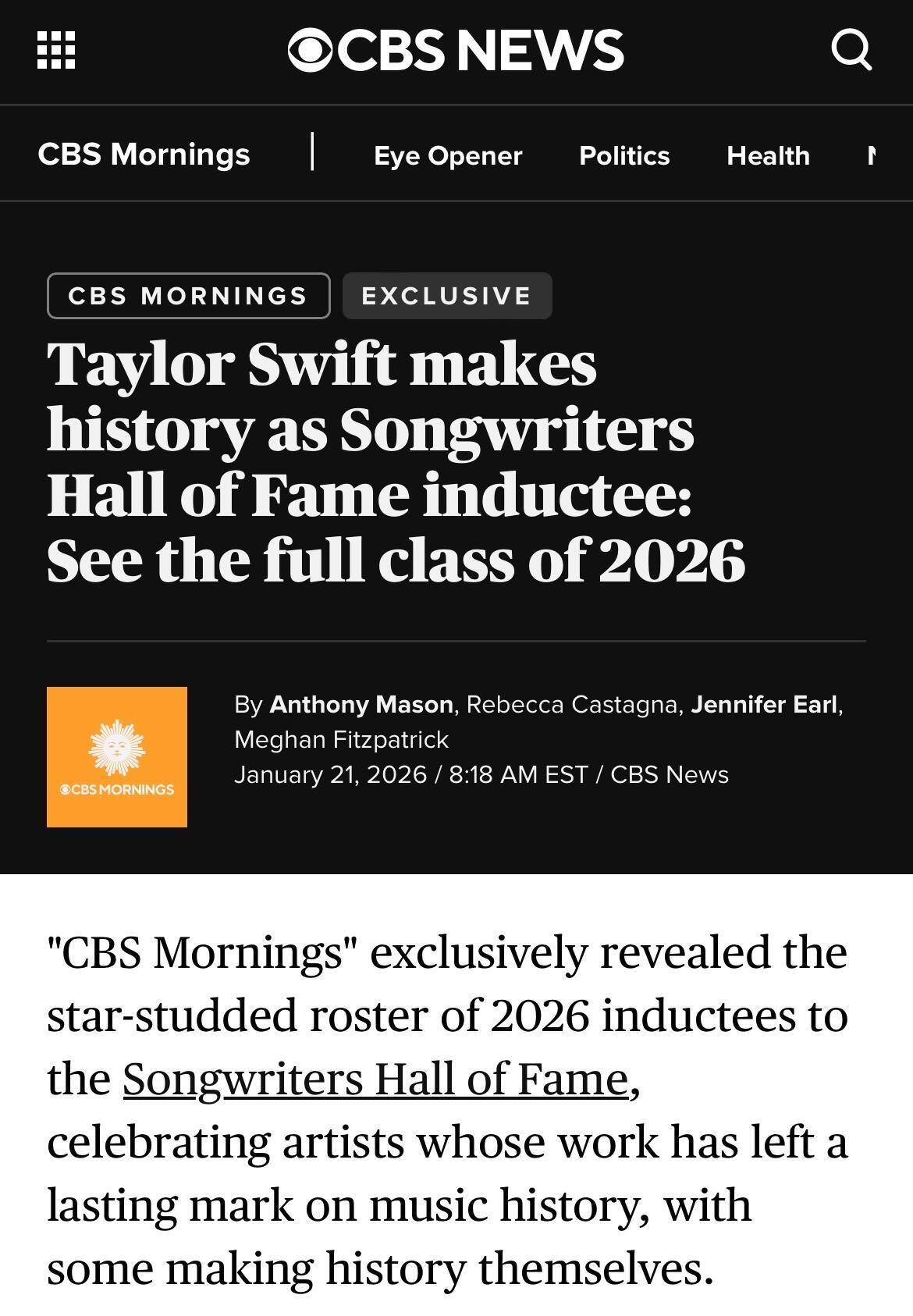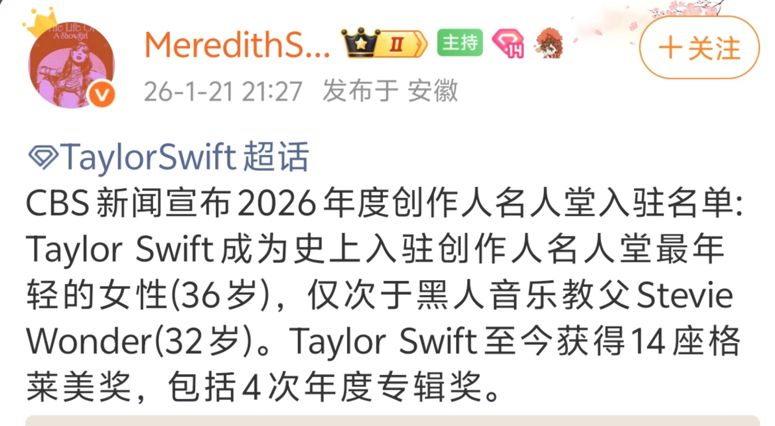 CBS新闻宣布2026年度创作人名人堂入驻名单:Taylor Swift成为史上入驻创作人名人堂最年轻的女性(36岁),仅次于黑人音乐教父Stevie Wonder(32岁)。Taylor Swift至今获得14座格莱美奖,包括4次年度专辑奖。